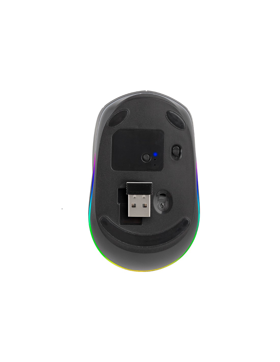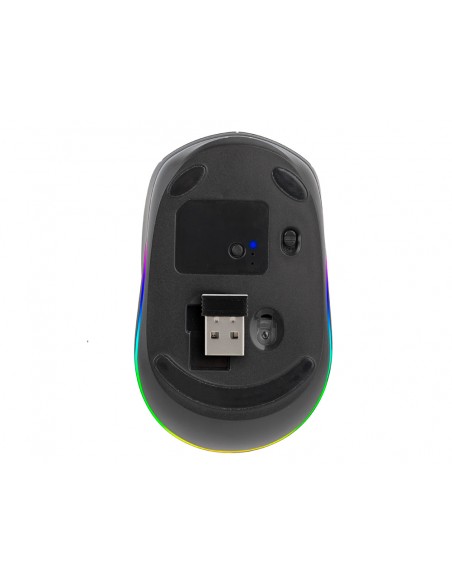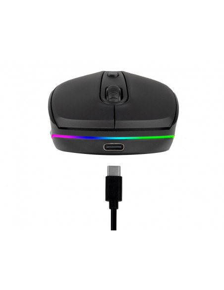 Ratolí sense fil recarregable amb tecnologia Bluetooth per a diversos dispositius. 2,4 GHz + BT3.0 + BT5.0, compatible amb 3 dispositius alhora. Canal per a USB de 2,4 GHz amb una connexió potent i fiable. Equipat amb una bateria de liti recarregable, fàcil de carregar amb el cable USB de tipus C inclòs. Inclou una roda de desplaçament de goma antilliscant amb un disseny òptim de lliscament i 3 botons. Clic silenciós. Disposa de retroil·luminació RGB personalitzable amb 15 colors. Ambidestre. Abast sense fils de 8-10 m. Fins a 50 hores de bateria en una sola càrrega. Botó d encesa/apagada d estalvi d energia.