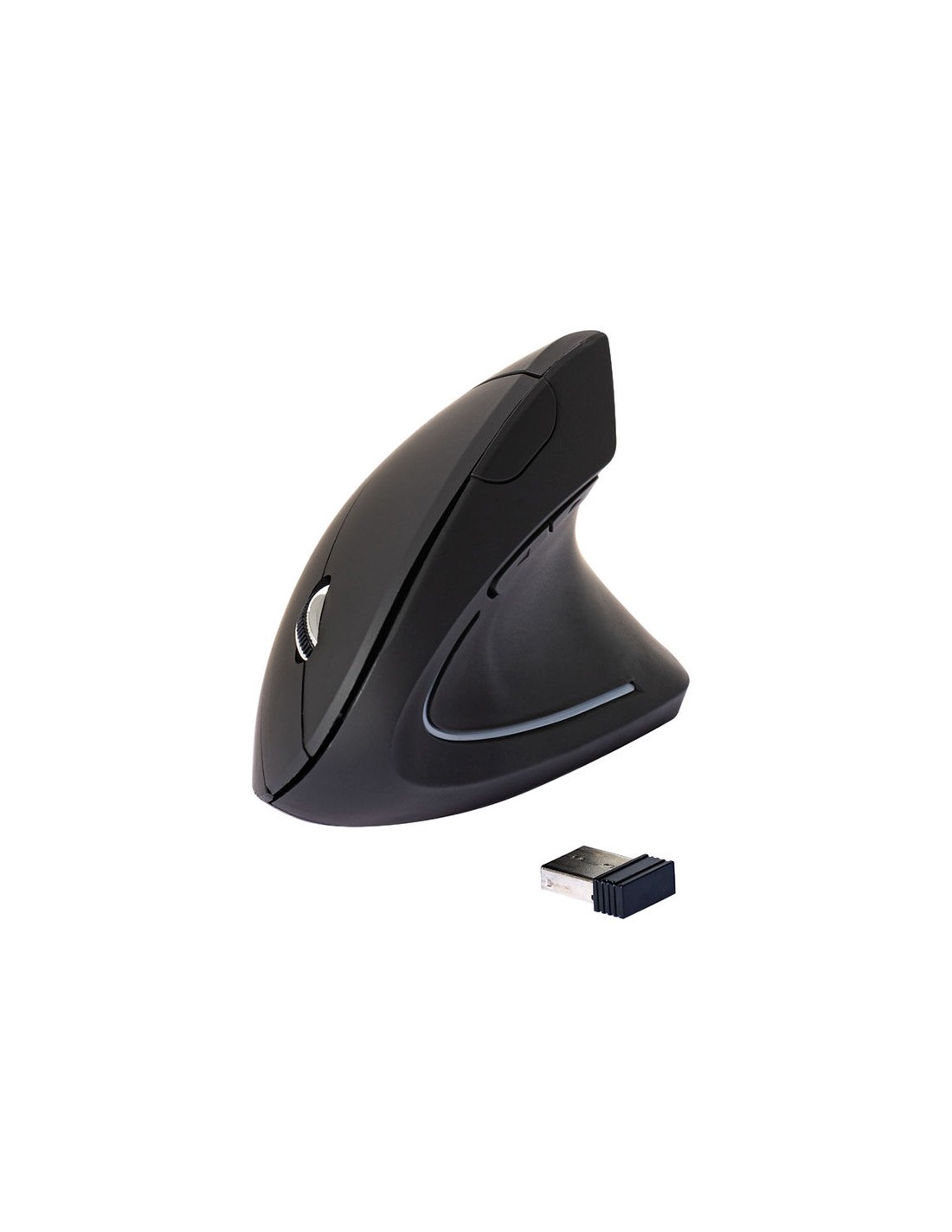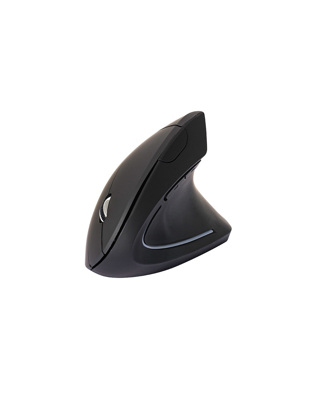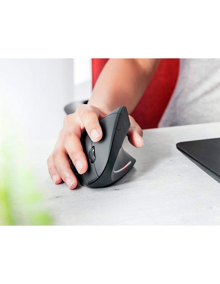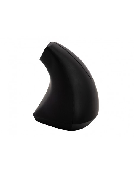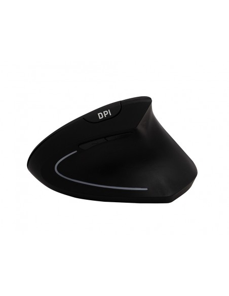Ratolí ergonòmic per a mà dreta. Ideal per reduir la tensió a nines i braços. Disseny vertical amb reposapulgar. 6 botons. Il·luminació LED. Sense cable. Funciona amb 2 piles AAA. Piles no incloses. Color negre. Mides: 123 x 65 x 82 mm. Pes 89 g.
