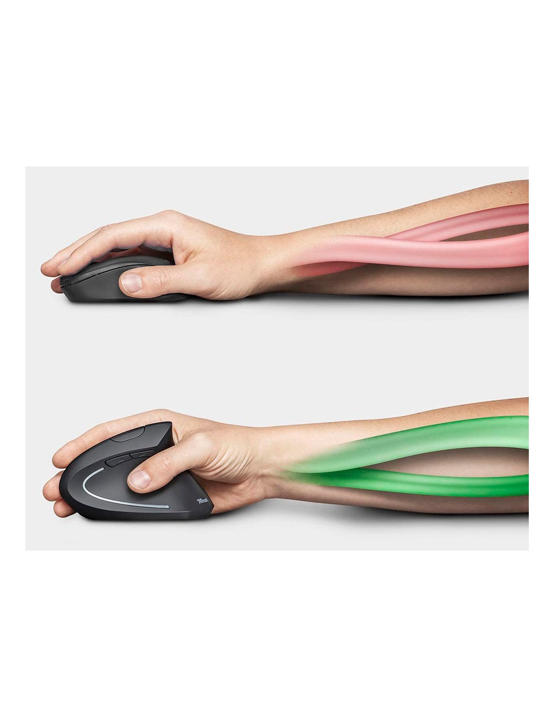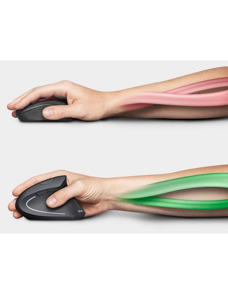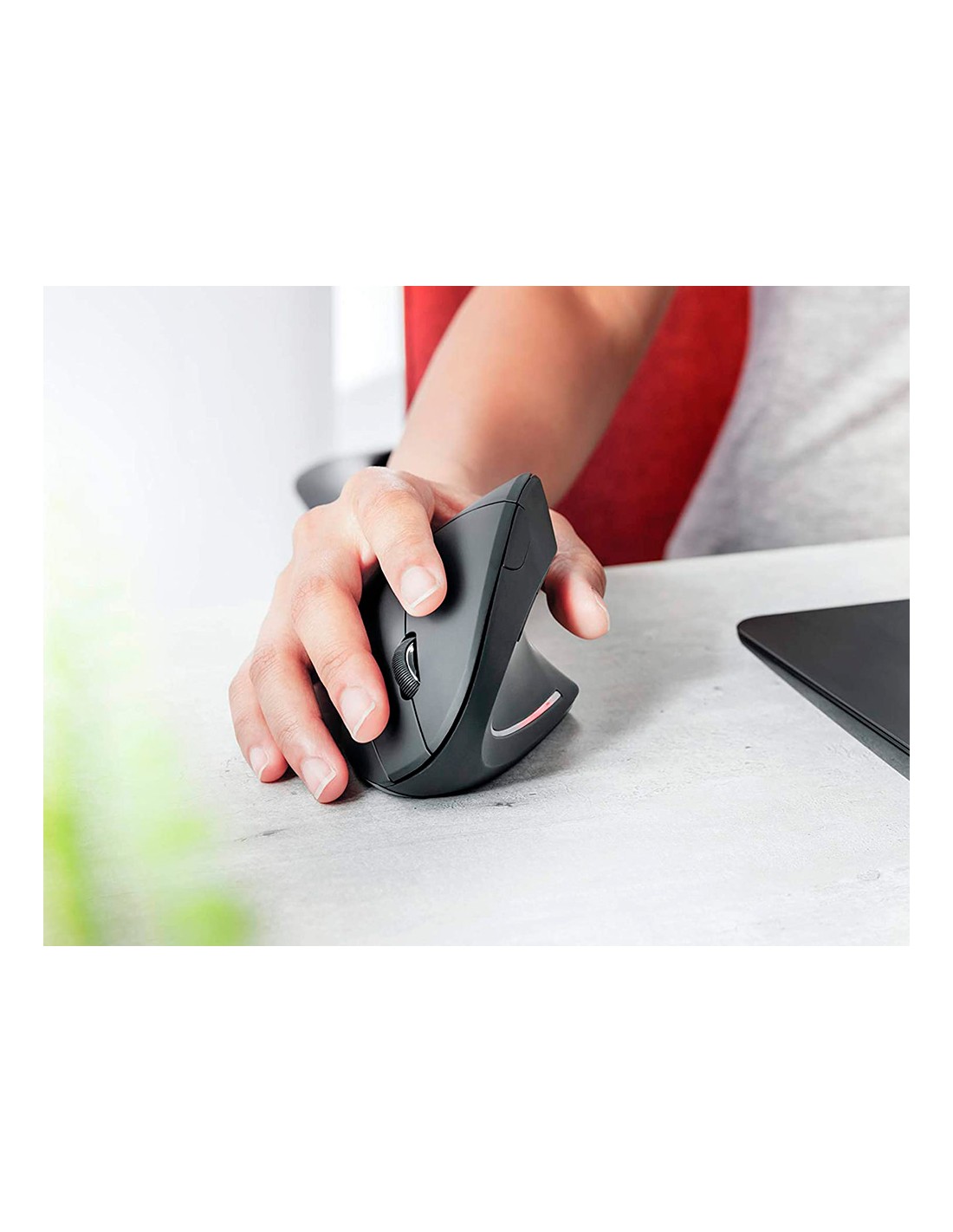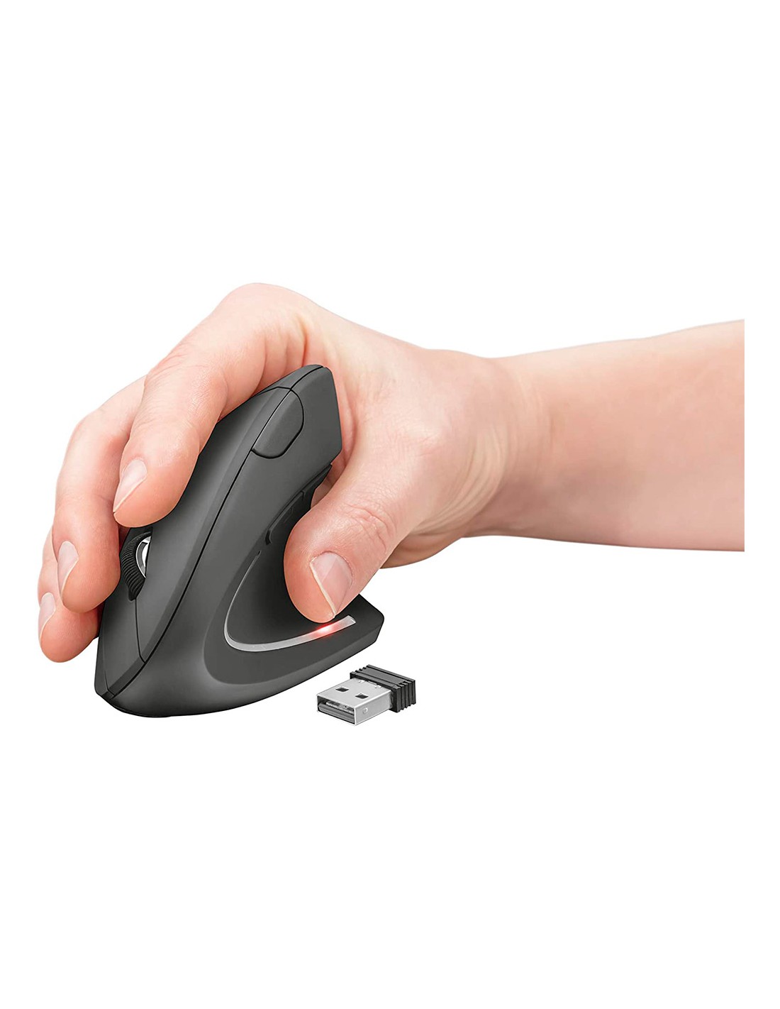 Ratolí ergonòmic per a mà dreta. Ideal per reduir la tensió a nines i braços. Disseny vertical amb reposapulgar. 6 botons. Il·luminació LED. Sense cable. Funciona amb 2 piles AAA. Piles no incloses. Color negre. Mides: 123 x 65 x 82 mm. Pes 89 g.
