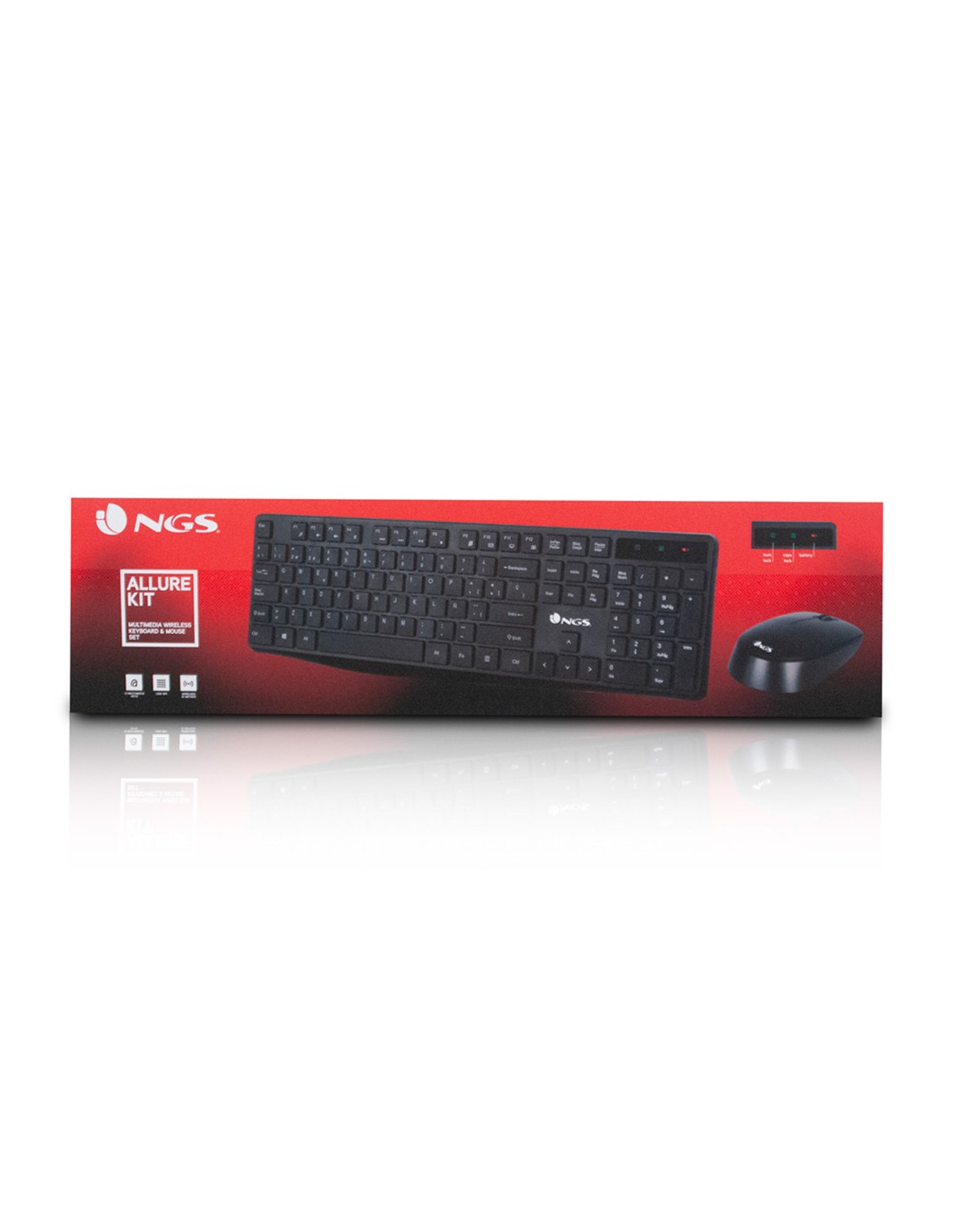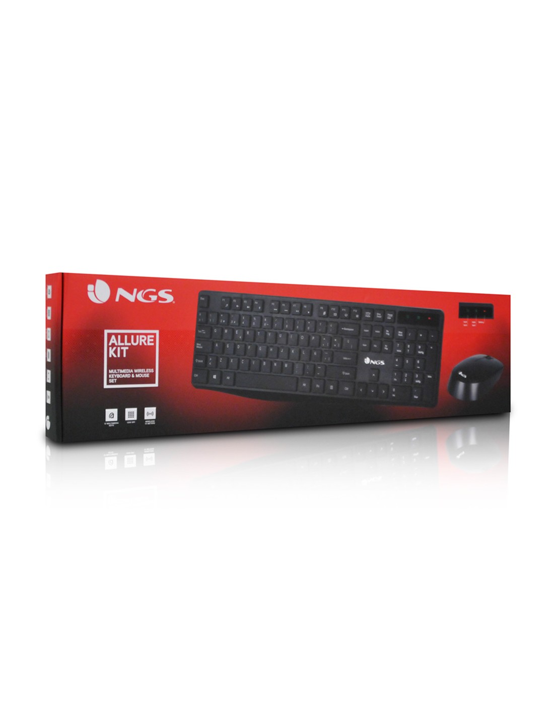 NGS Allure Kit és un conjunt de teclat i ratolí sense fil de 2,4 GHz. amb tecles multimèdia i disseny elegant slim que facilitaran als usuaris les seves tasques informàtiques quotidianes. El ratolí òptic de 1200 dpi està dotat d una gran precisió en els moviments. Inclou roda antilliscant per proporcionar una major subjecció amb scroll i 2 botons. Incorpora un nano receptor que es pot transportar al mateix ratolí o quedar connectat permanentment al portàtil sense risc de caiguda o pèrdua. El ratolí compacte és apte tant per a usuaris dretans com esquerrans. El teclat presenta un disseny de mida completa amb teclat numèric. Compte amb 12 tecles FN + multimèdia que fan més fàcil i ràpid l accés a les diferents apliplicacions de l ordinador i les seves habituals funcions. Així com indicadors LED per a Majúscules, Bloqueig Numèric i nivell de bateria baixa. La pulsació de les tecles de perfil baix és molt suau, còmoda i el soroll que emetussades és pràcticament imperceptible