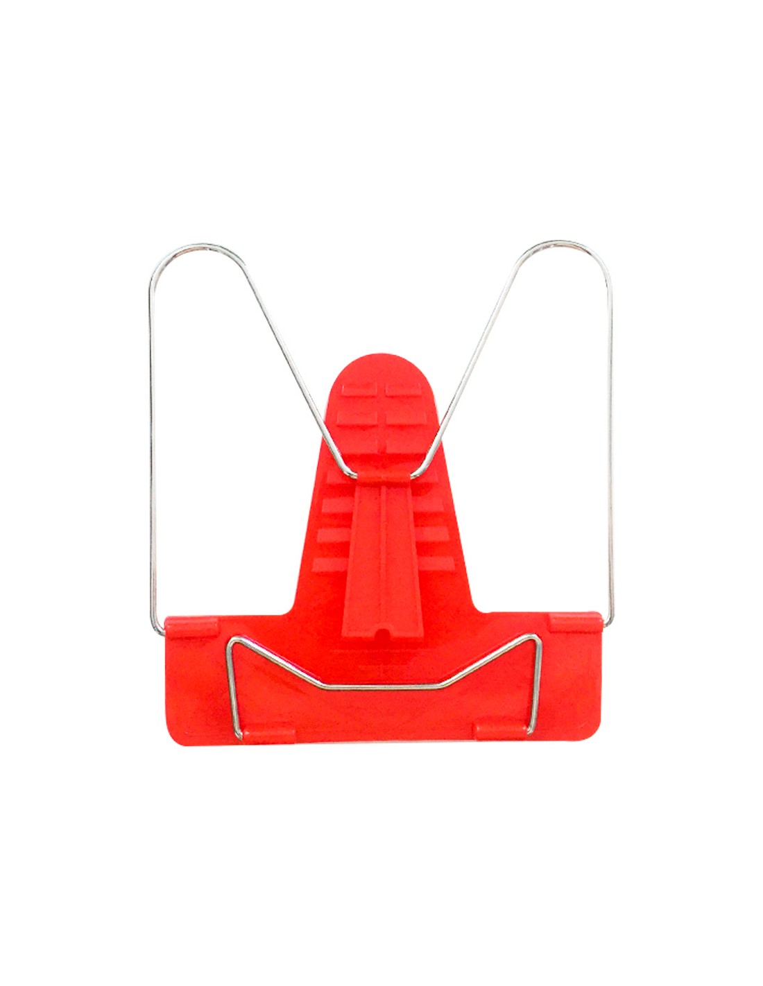 Faristol amb base de plàstic i pinça de metall. Per subjectar llibres, llibretes, folis... Amb 7 posicions diferents. Color vermell. Mides 190 x 215 mm.