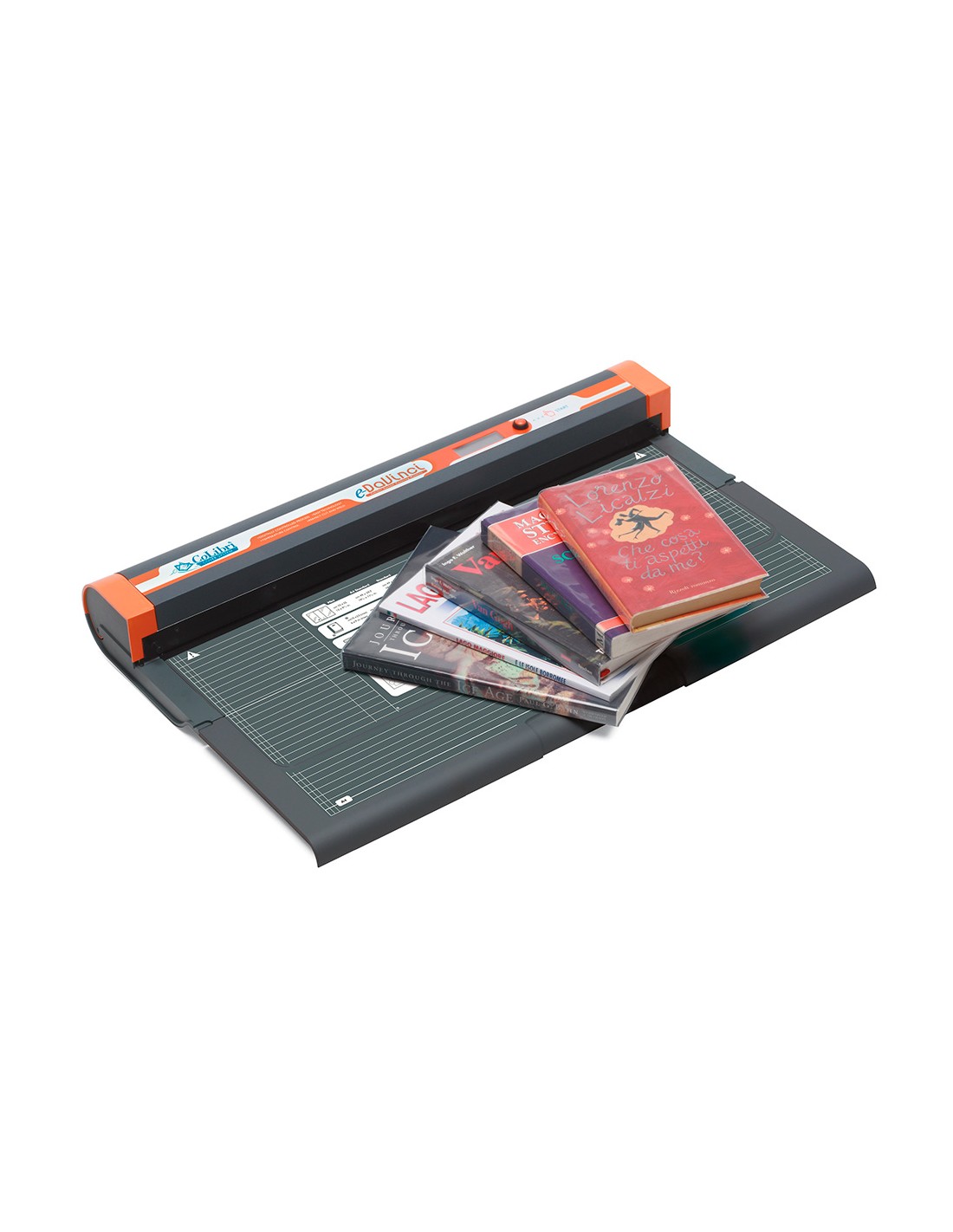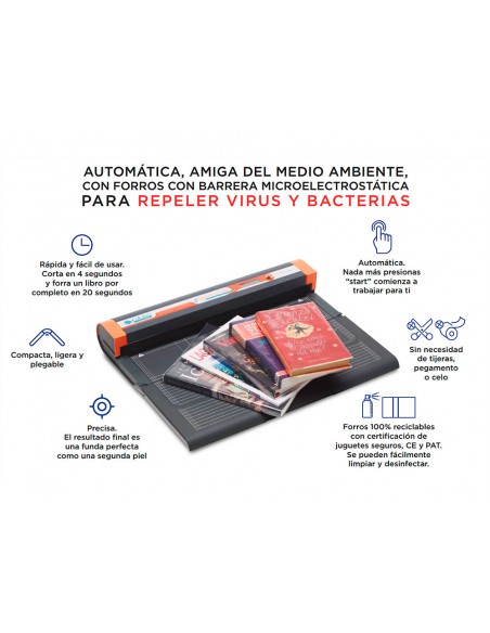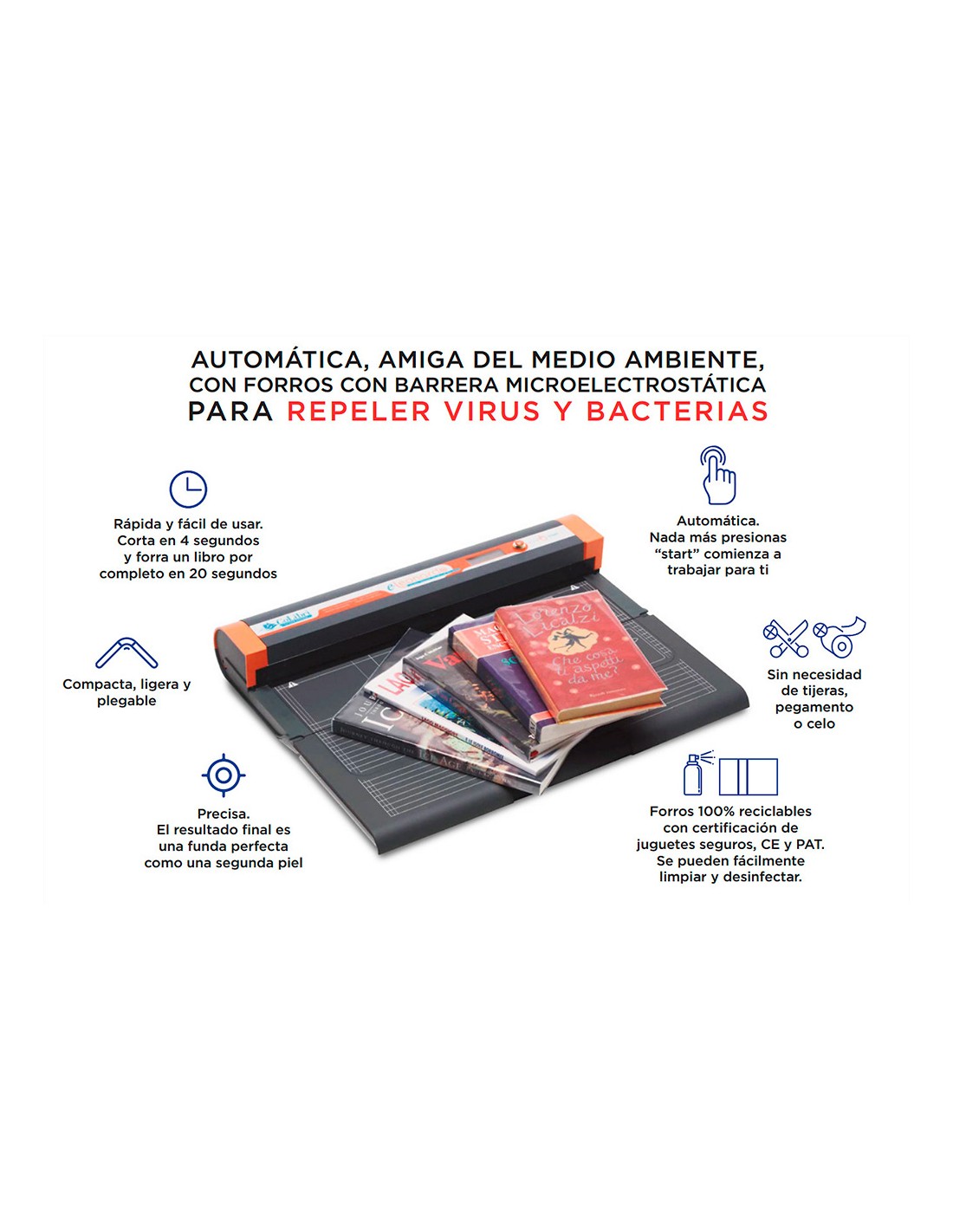 Màquina automàtica per folrar qualsevol tipus de llibre. Realitza fundes que s ajusten com una segona pell a qualsevol mida. Amb un modern control electrònic i sensors controlats digitalment. Controla la temperatura, el temps i la pressió per soldar i tallar a la perfecció. Posseeix un display animat que diu en tot moment què cal fer i què està fent ella. Cal utilitzar exclusivament amb el material marca CoLibrì. Màxima velocitat de tall 2,5 segons. Longitud màxima de soldadura 500 mm. Mides 560 x 90 x 410 mm. Pes 5 kg.