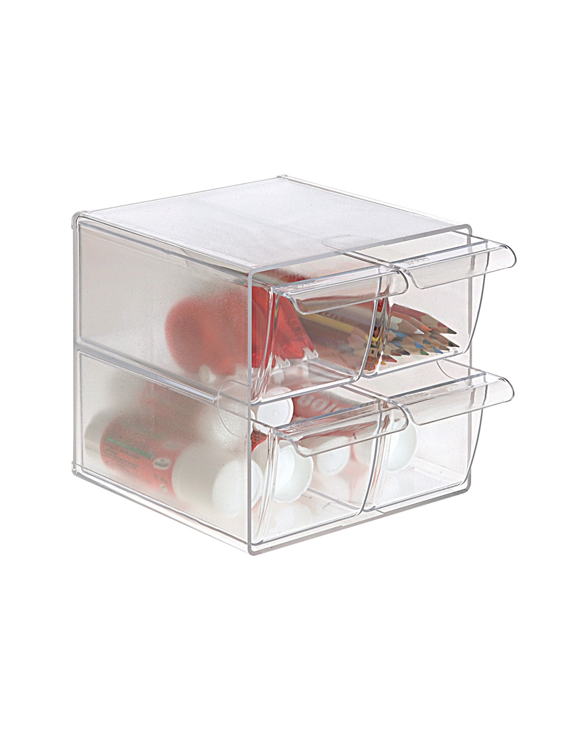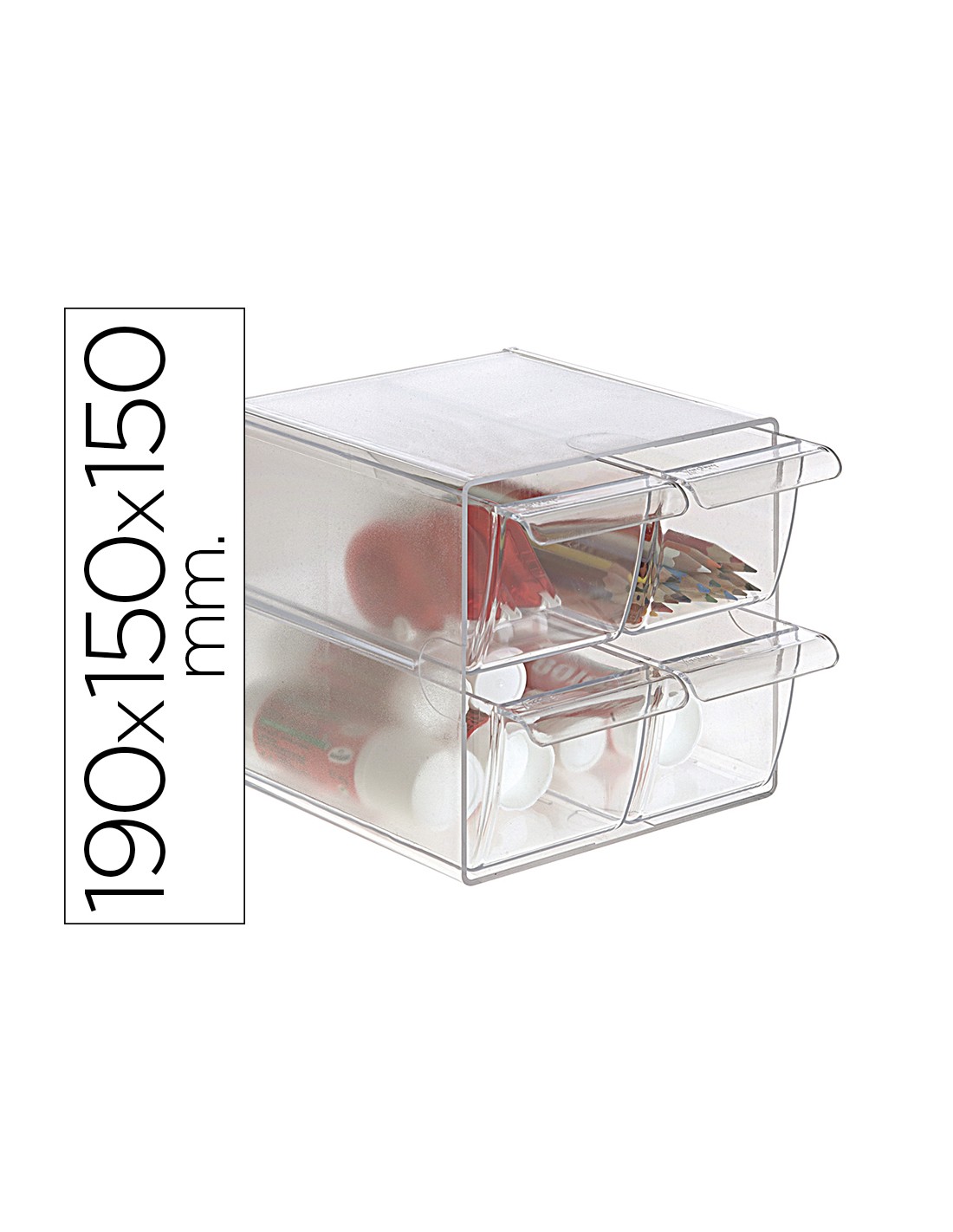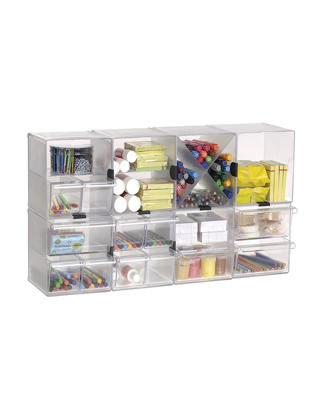 Organitzadors modulars fabricats en poliestirè injectat transparent de gran qualitat i brillantor. Permet unir-los i apilar-los en vertical i horitzontal o amb diferents combinacions de calaixos mitjançant clips de subjecció (2 clips inclosos per model).