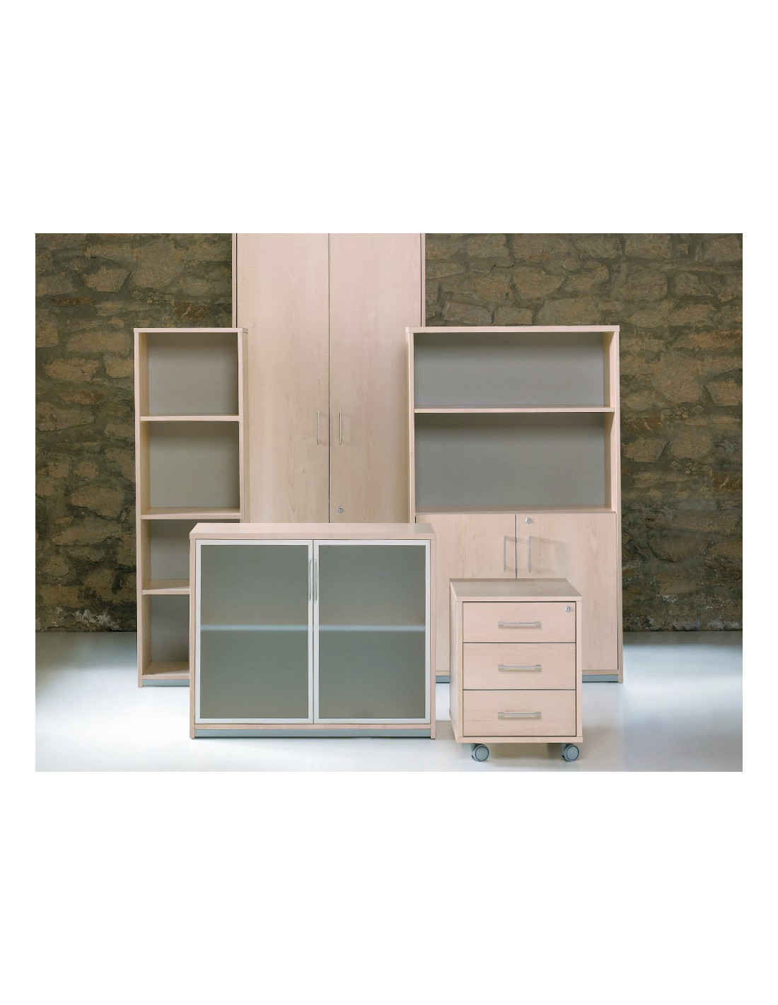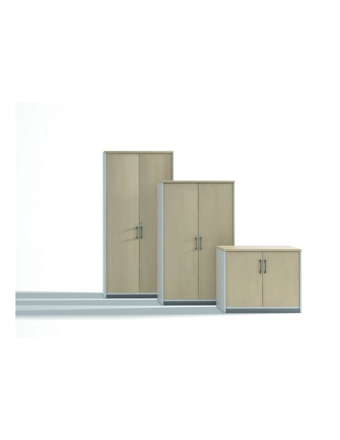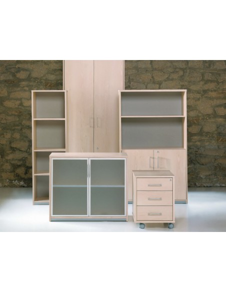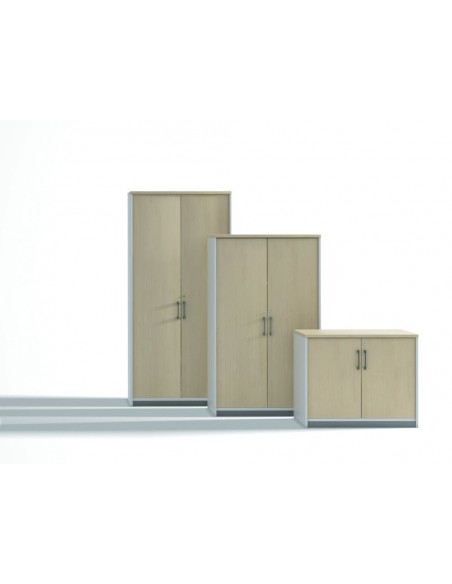 Armari de fàcil muntatge. Estructura en un 25% acer i un 75% poliestilè. Portes de polipropilè de 8 mm. Nanses i panys amb dues claus incloses. Capacitat per a 9 arxivadors de palanca. Pany amb tapa plegable per amagar-la.