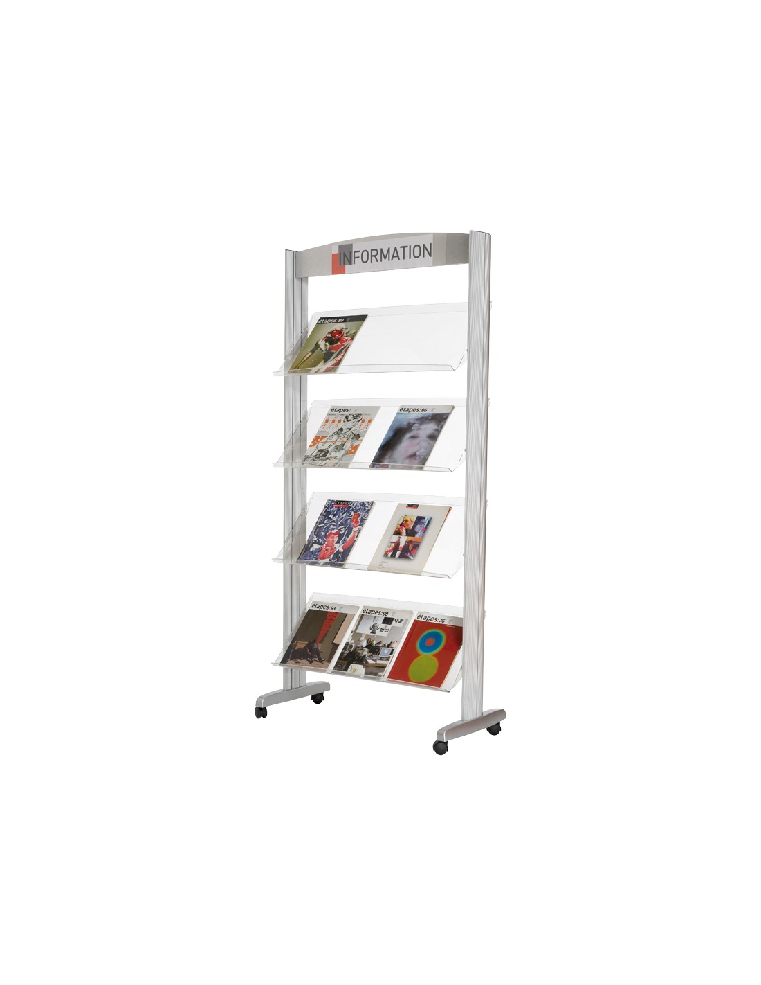 Expositor mòbil d'estructura metàl·lica, acabat de poliestirè i prestatges transparents. Té 4 prestatges amb vores de 3,8 cm d'amplada. Per a documents de diferents formats: DIN A3, DIN A4, DIN A5, postals, etc. Permet una visibilitat completa dels docume