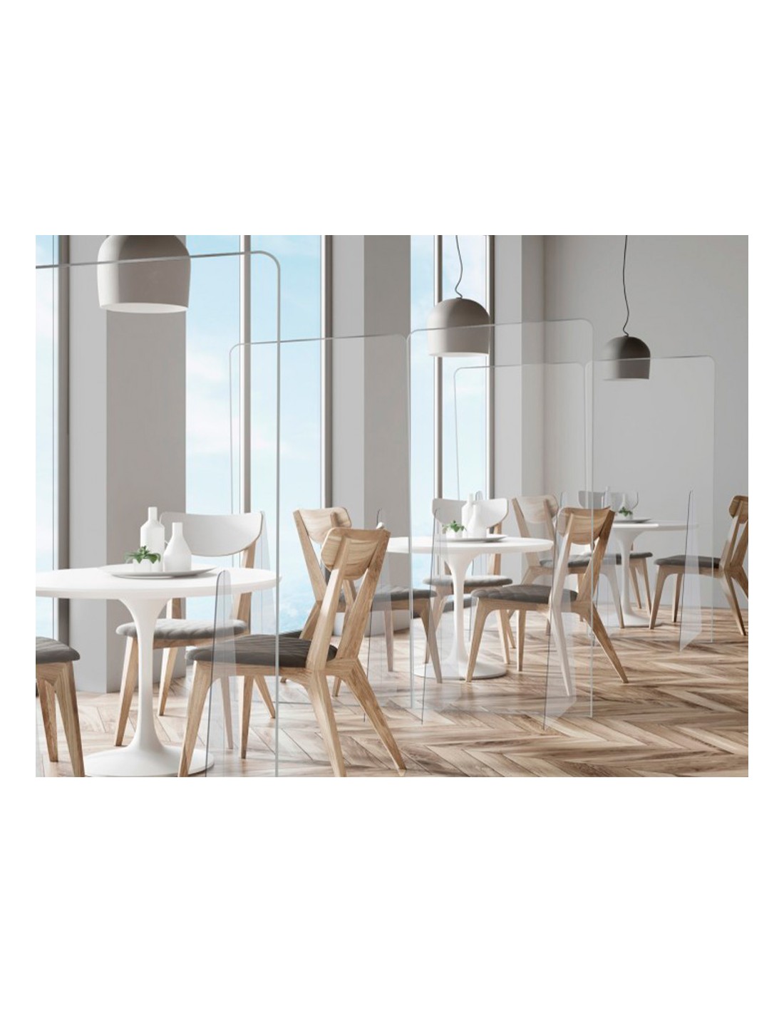 Ideals per al seu ús a fàbriques, oficines, restaurants, hotels, perruqueries i tot tipus de comerços, evitant el contacte directe de treballadors i clients. Mampara de peu. Fabricada amb acrílic. Perfecta visibilitat a banda i banda de la mampara de prot