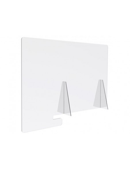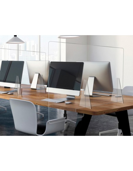 Pantalla d'oficina separadora ideal per garantir la seguretat a llocs de treball de telemàrqueting ia oficines. Fabricada amb metacrilat transparent. Disposa de ranura de seguretat antibolcada (35 mm) que encaixa sota el tauler i garanteix la seva estabil