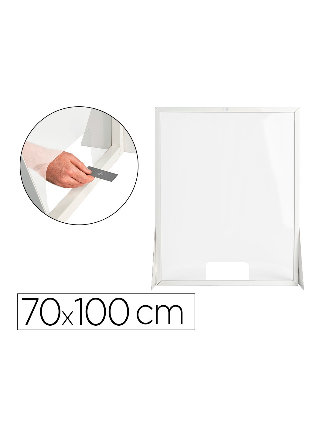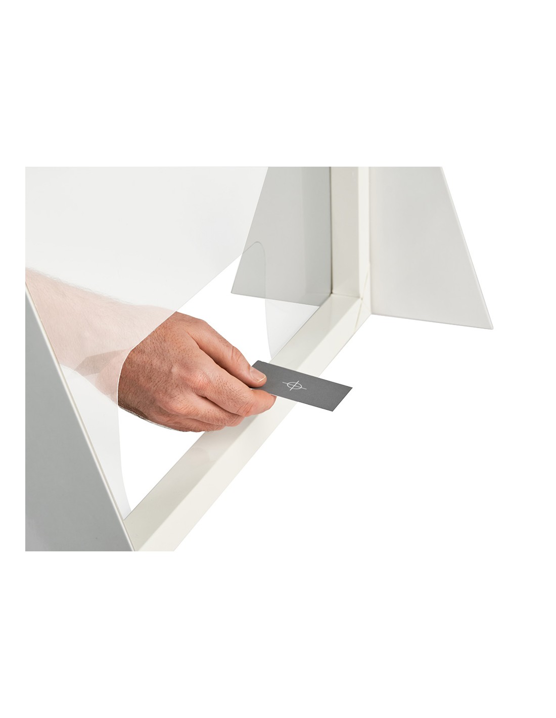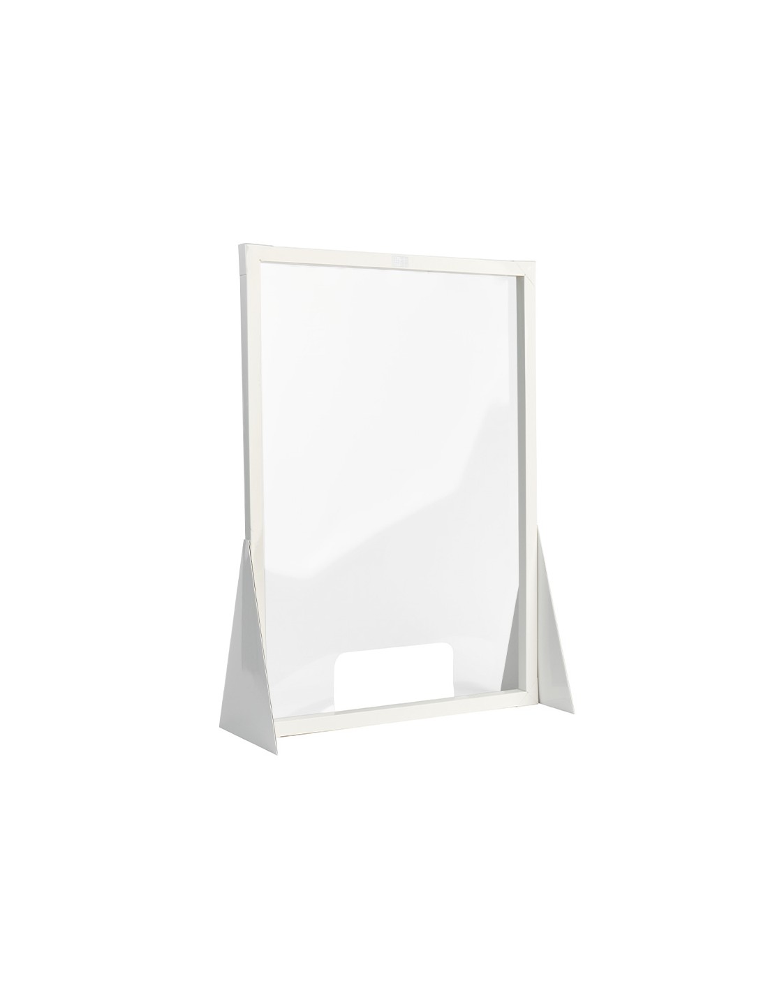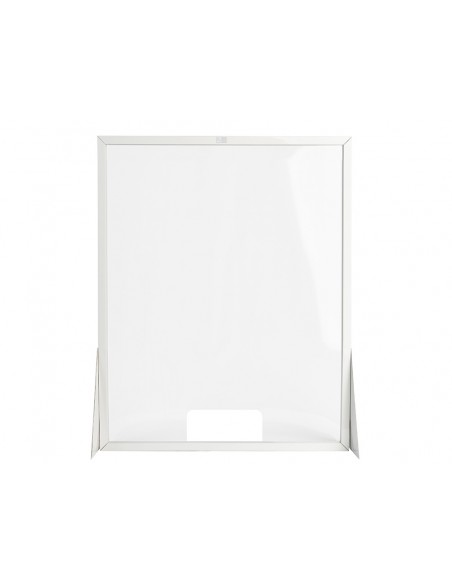 Pantalla de protecció amb perfil de cartró. Lleugera però estable. Ideal per intercanviar documents o petits objectes gràcies a la finestra central inferior. Inclou dues peanyes per a una estabilitat més segura. Netejar només amb aigua i sabó. Disponible
