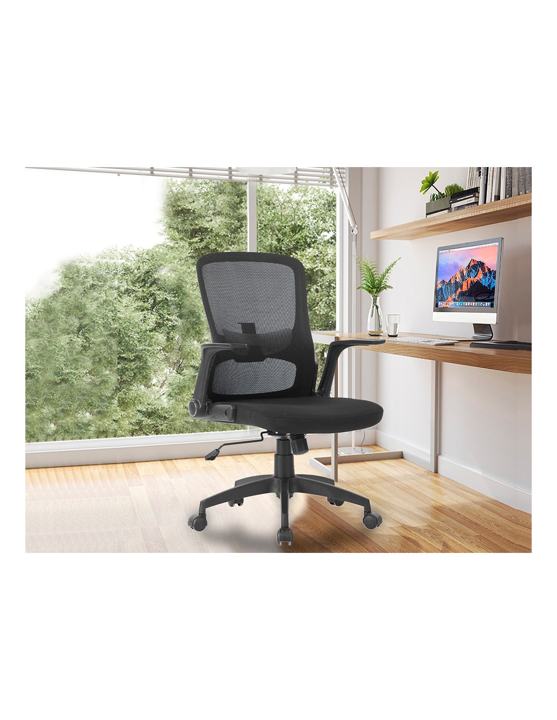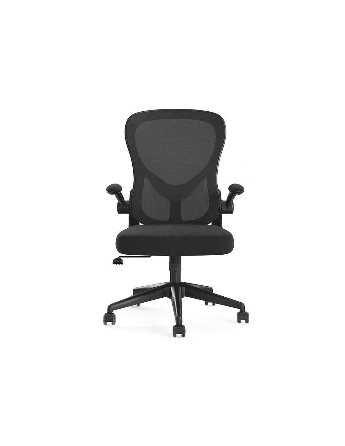 Cadira giratòria 360° regulable en alçada. Disseny de gran comoditat. Seient i respatller seient entapissat en tela i respatller en malla amb suport lumbar. Pistó de gas per a regulació d alçada. Base plàstic molt resistent amb 5 rodes. Alçada de la cadira 91 + 7,5 cm. Alçada del respatller 48,5 cm. Alçada del seient 42,5-50 cm. Ample del seient 61 cm. Profunditat del seient 55 cm. Braços polipropilè. Reclinables. Rodes de niló. Niló 6 cm Ø. Hores dús 8 hores. Pes de la cadira/pes màxim suportat 9,3 kg / 130 kg.