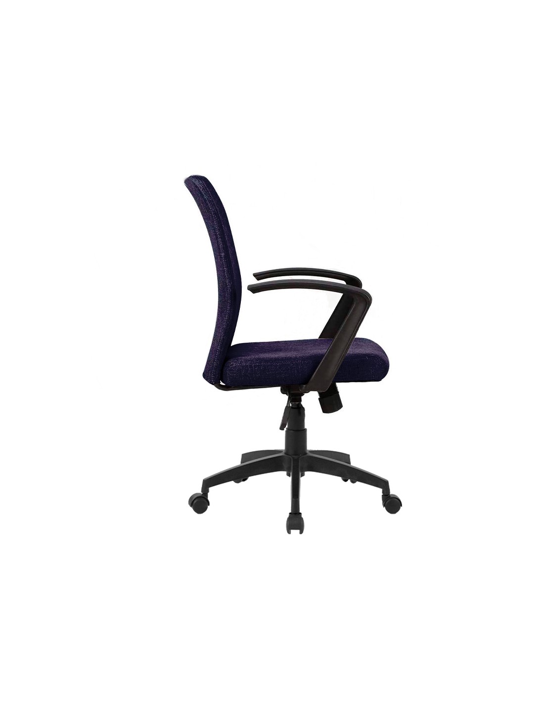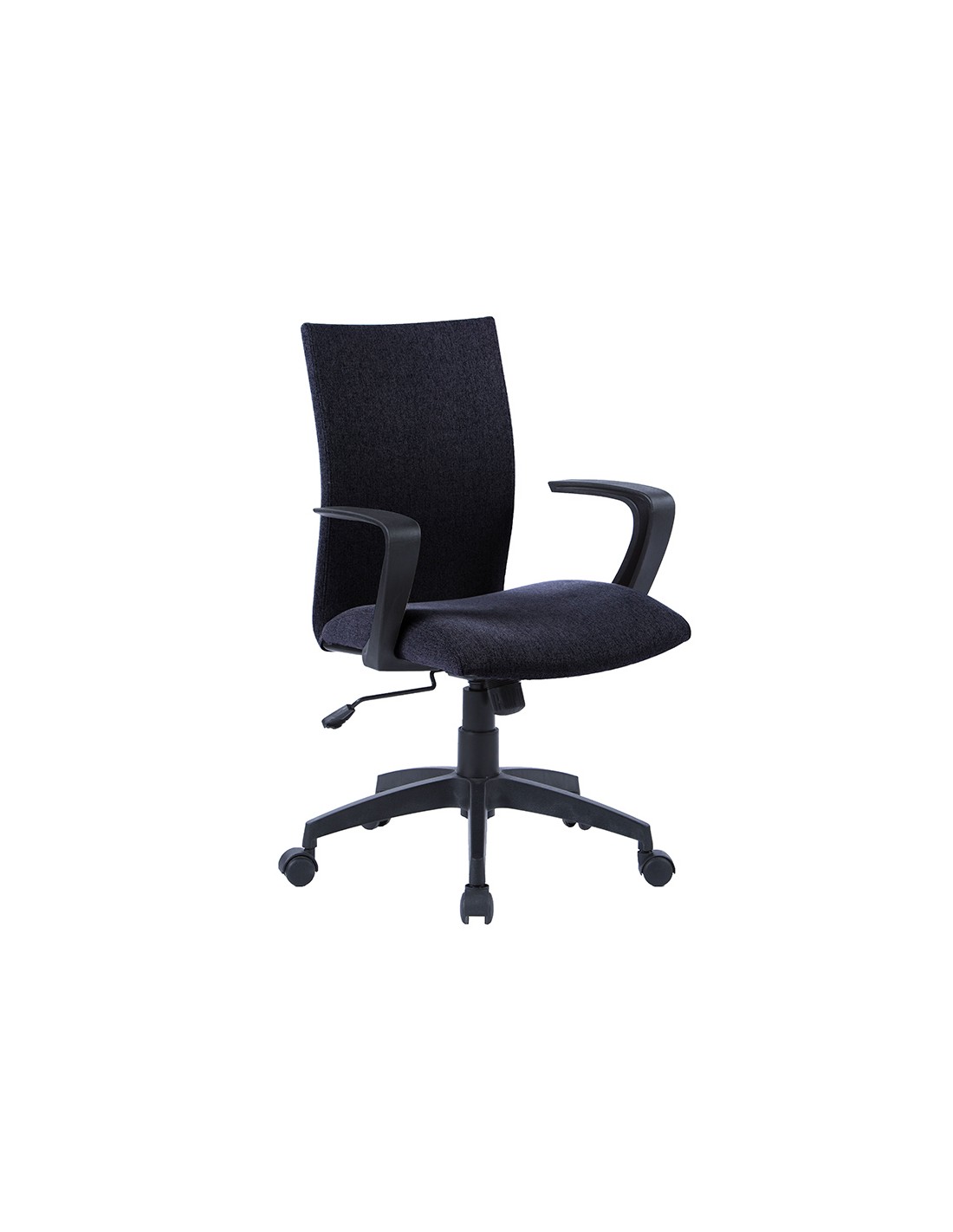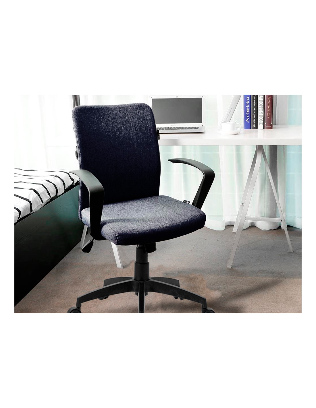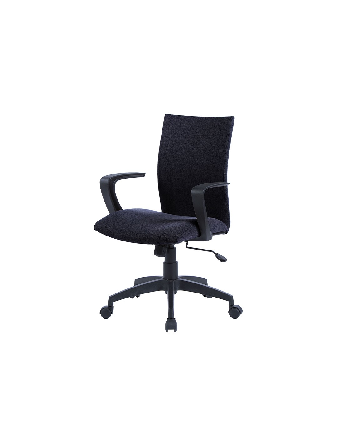 Cadira giratòria regulable en alçada. Seient i respatller entapissats en tela. Pistó cilindre de gas per a regulació d',alçada. Base plàstic. Alçada de la cadira 89,5 + 11 cm. Alçada del respatller 44 cm. Alçada del seient 44,5-54 cm. Ample del seient 46 cm. Profunditat del seient 55 cm. Braços fixos de plàstic negre. Rodes niló. 6 cm Ø. Hores dús 5 hores. Pes de la cadira/pes màxim suportat 10 kg/130 kg.
