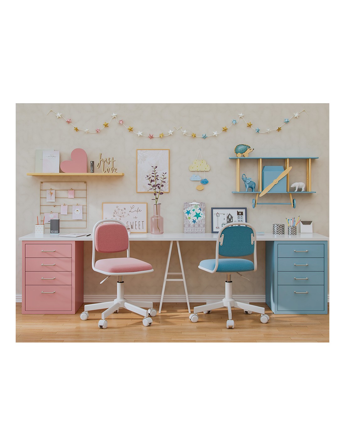 La cadira infantil presenta una estructura BLANCA amb un bonic color blau pastís, que li confereix un disseny fresc i juvenil. Fabricada amb materials de qualitat, aquesta cadira ofereix comoditat i durabilitat pels més petits. Compta amb un mecanisme d ajust que permet regular fàcilment l alçada del seient segons les necessitats. El pistó de gas pintat de 100 mm garanteix un ajustament suau i segur. La base de niló de 300 mm i les rodes de niló proporcionen estabilitat i fluïdesa de moviment, ideals per al seu ús a diferents superfícies. Amb aquesta cadira, els nens podran gaudir d',una experiència còmoda i segura al vostre escriptori.