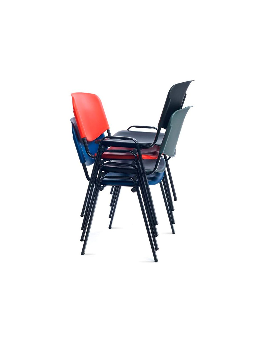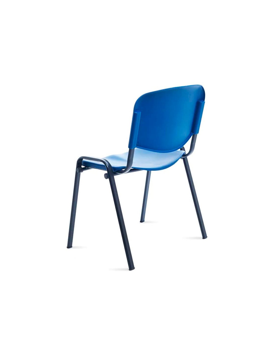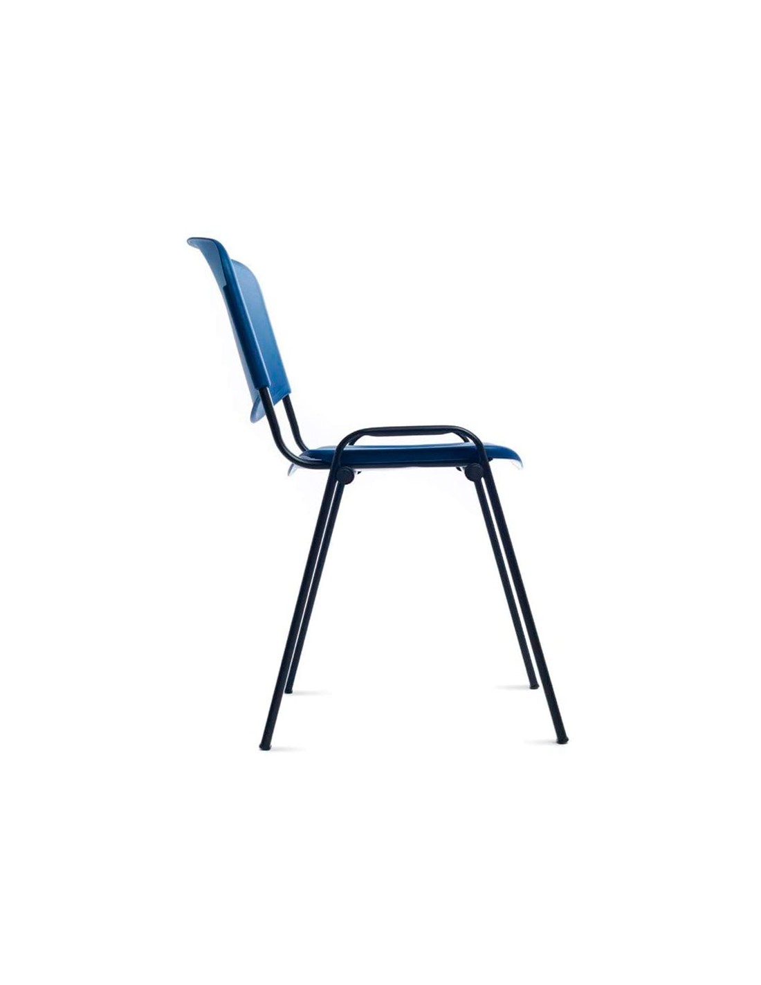 Cadira apilable. Suport i seient: polimèric tècnic. Colors: blau i negre. Base: estructura tubular metàl·lica reforçada pintada en epoxy color negre. Alçada de la cadira: 81 cm. Alçada del seient: 48 cm. Ample del seient: 57 cm. Profunditat del seient: 41