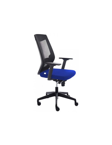 Cadira giratòria regulable en alçada. Mecanisme sincronitzat d',inclinació. Fàcil muntatge. Seient i respatller: seient entapissat en tela ignífuga sobre escuma injectada. Color blau. Suport amb suport lumbar en malla negra transpirable. Pistó: de gas