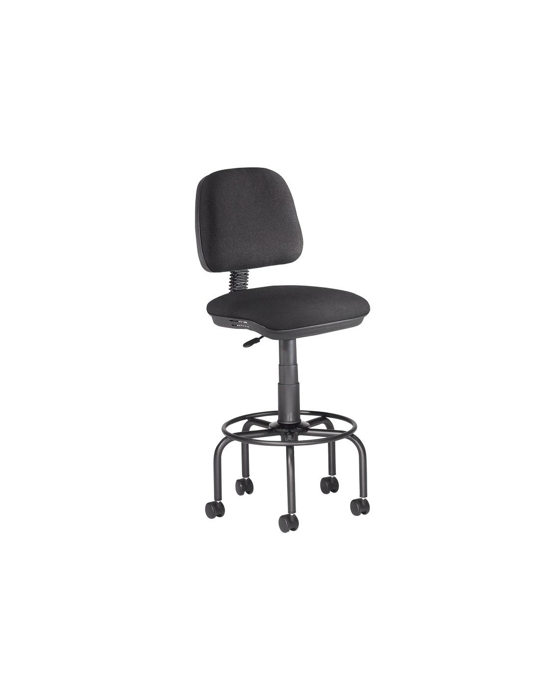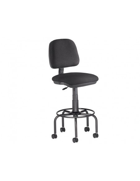 Ergonòmic i giratori 360 graus. Regulable en alçada. Seient i respatller: entapissats en tela ignífuga color negre. Respatller regulable en alçada i separació. Pistó: cilindre de gas. Base: metàl·lica amb cinc peus. Alçada del tamboret: 92,5 + 13 cm. Alça