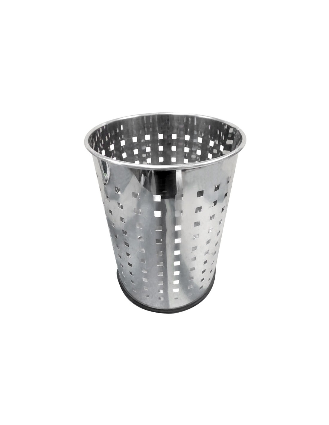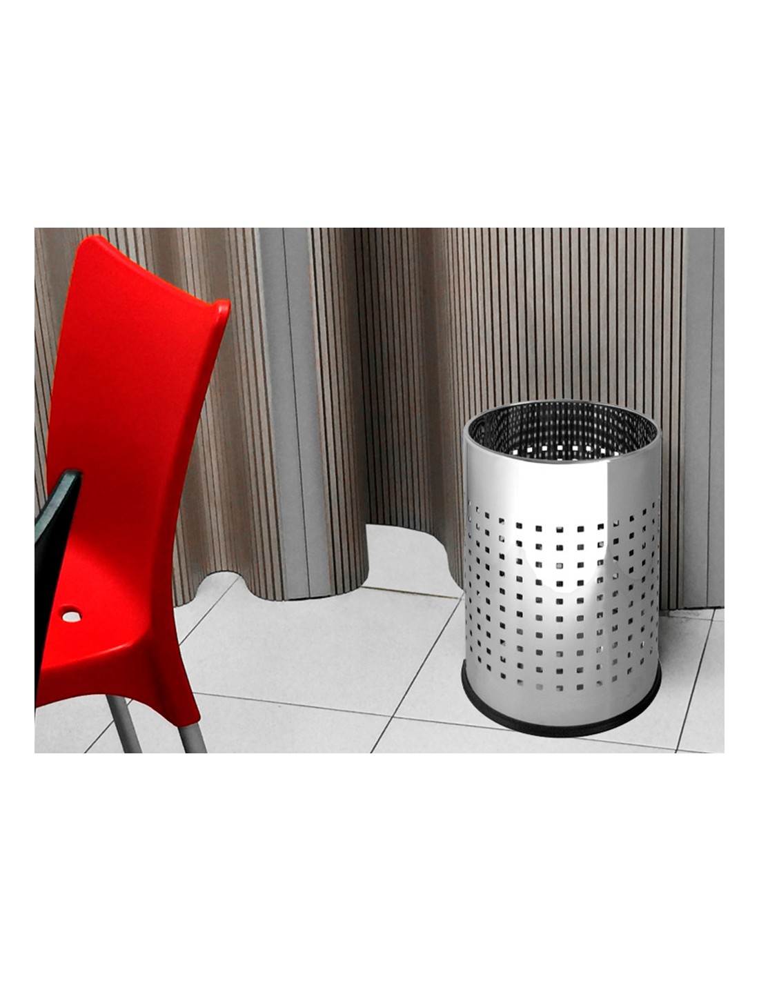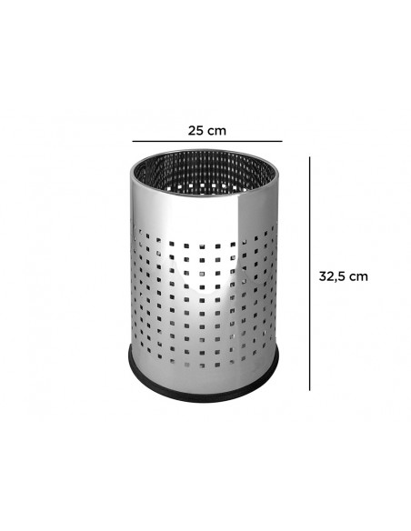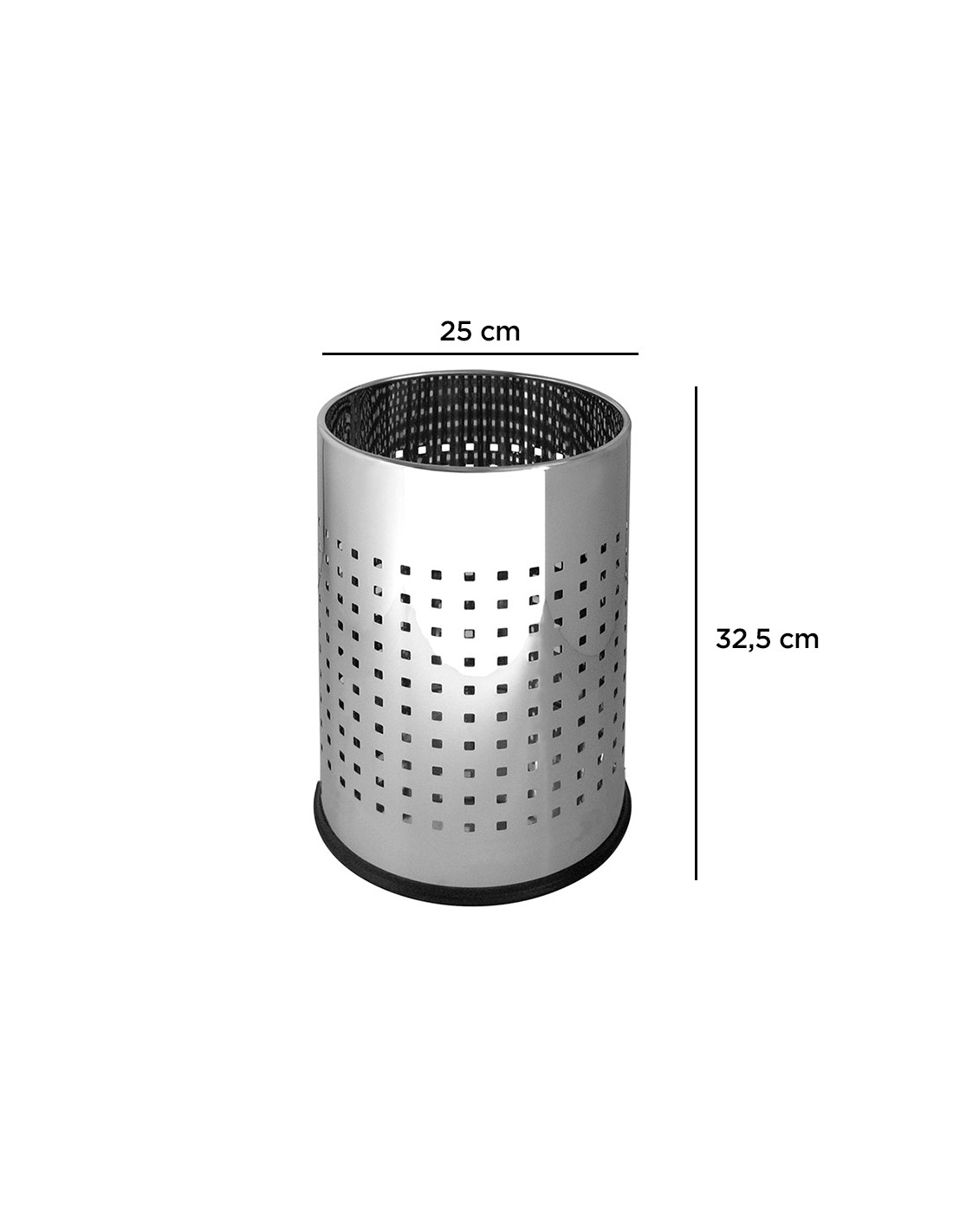 Paperera metàl·lica amb forma rodona. ARO inferior fabricat en PVC. Acabat cromat. Perforada. Capacitat: 12 litres. Mides: Ø 25 x 32,5 cm.