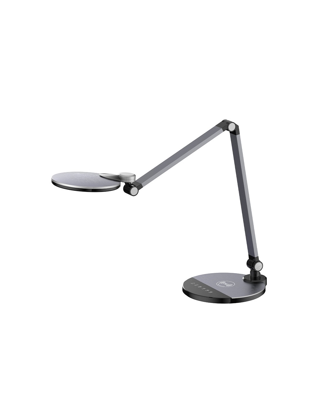 Làmpada de sobretaula fabricada amb ABS amb acabat en alumini. Interruptor tàctil, ajustament de temperatura de 3 colors amb atenuació contínua. Càrrega sense fil ràpida per als dispositius compatibles amb llum indicant el nivell de càrrega. Cap i braç or