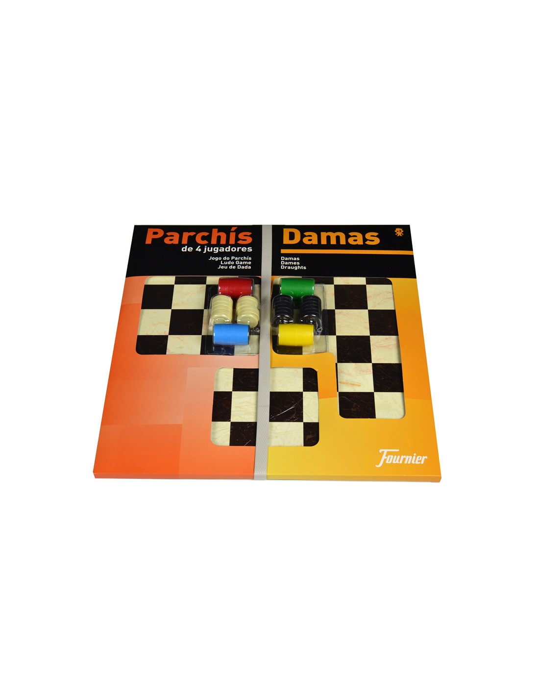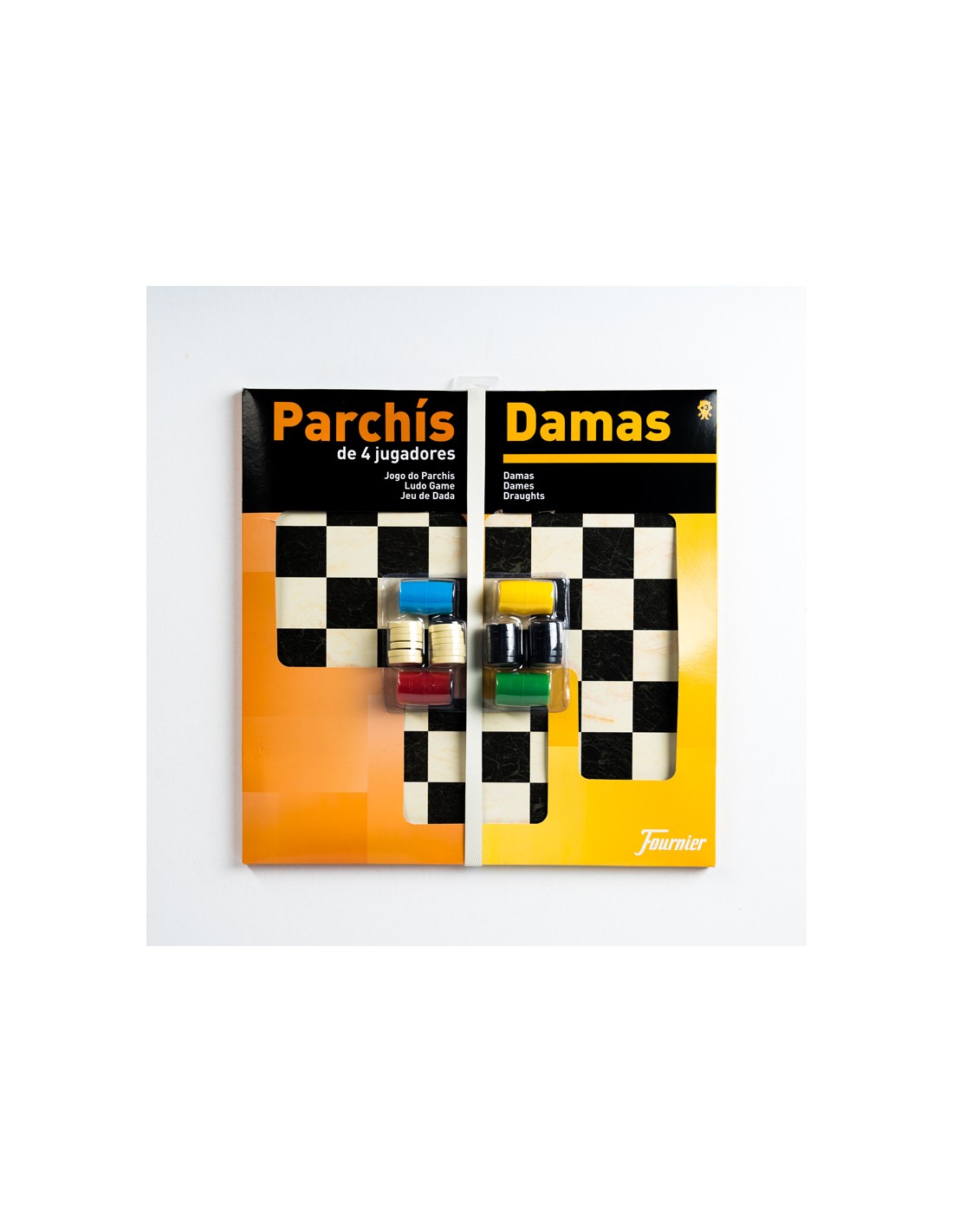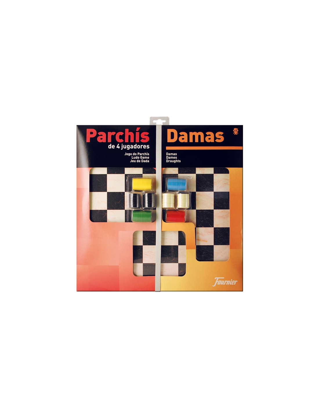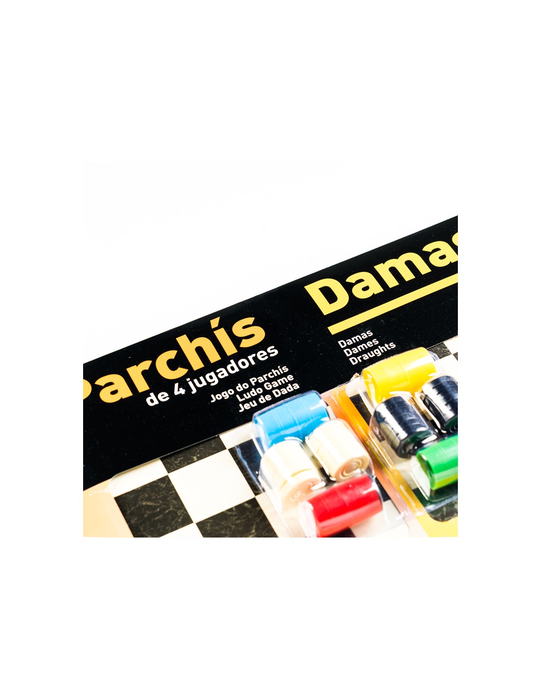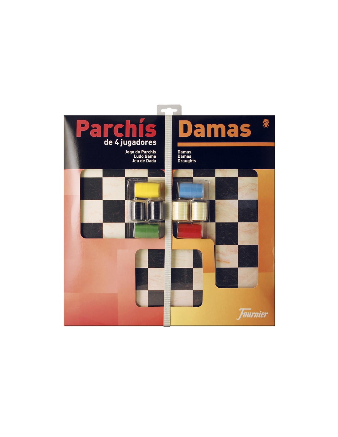 Joc de parxís per a 4 jugadors amb dames. Conté tauler, 4 gobelets, 4 daus i fitxes de 4 colors. Fitxes de dames de plàstic. Caixa per desar accessoris. Mides 400 x 400 mm.