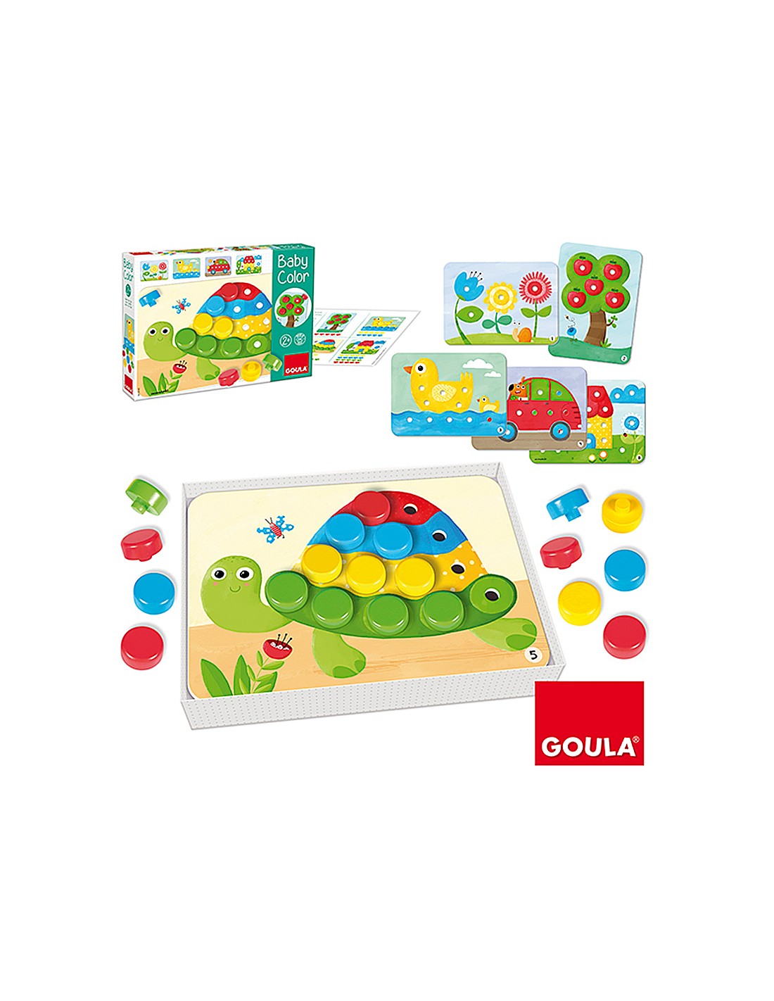 Divertit mosaic de fusta per aprendre els colors encaixant correctament els pivots a cada làmina. Pivots molt gruixuts per a nens petits. Làmines progressives de menys a més dificultat. Il·lustracions cridaneres pel seu colorit. Aprenentatge dels colors b