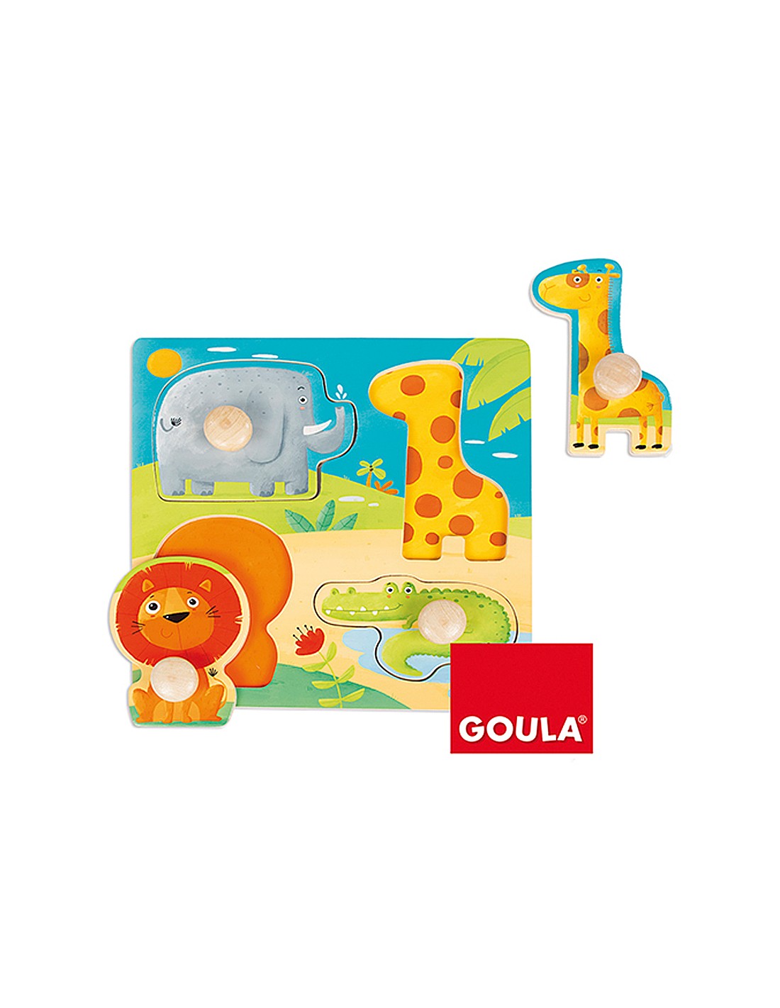 Original trencaclosques de 4 peces de fusta per als més petits. Iniciació al món de la selva amb quatre animalets. Els pivots són grans per facilitar l'adherència al nen. Desenvolupa la coordinació manual ull/mà. Destresa manual i aprenentatge dels colors