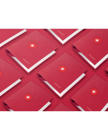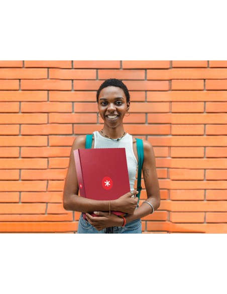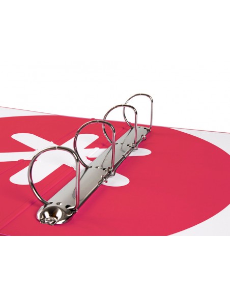 Carpeta fabricada amb cartró folrat de 1,5 mm de gruix. Folrada en paper estucat de 135 g/m² imprès. Plastificada mat amb detalls en vernís UVI. Amb 4 anelles de 40 mm. Guarda interior impresa. Format DIN A4.