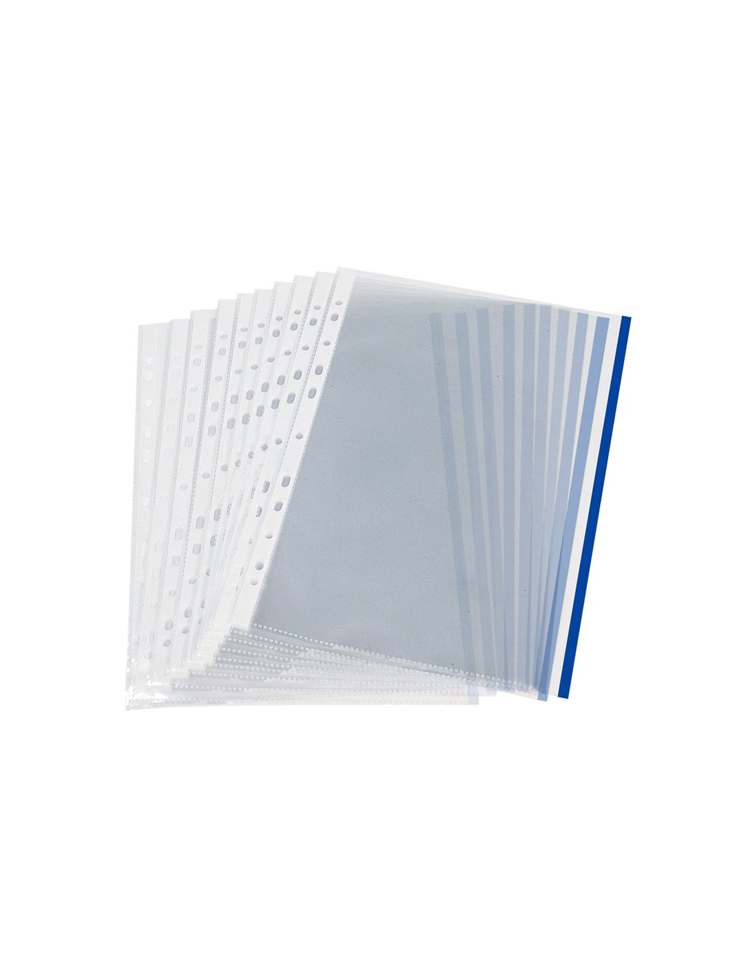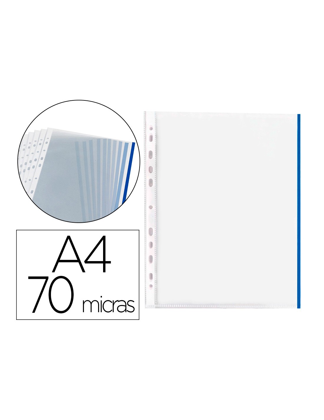 Funda per a la protecció i arxiu de documents. Amb vora de color que ajuda a classificar i distingir la informació. Fabricada en polipropilè vidre llis. 8 forats. Grossor: 70 micres. Colors: groc, blau, negre, vermell i verd. Format DIN A4. La bossa de 10