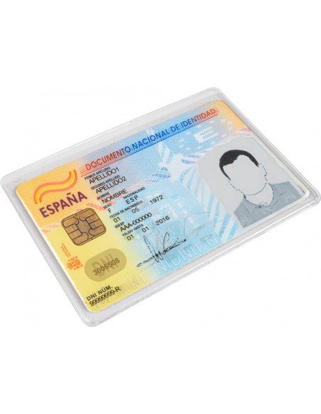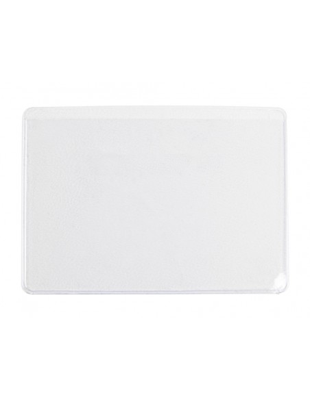 Fabricada amb PVC. Amb obertura superior i lateral. Amb ungler. Color vidre transparent. Format DNI. 130 micres.