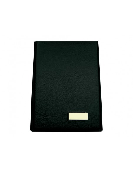 Portafirmes extra amb materials acabats en símil pell i portada encoixinada. Amb llom tipus manxa. Amb compartiments de doble cartolina reforçada i escalonada. Amb visor a la portada. Mides 250 x 335 mm.
