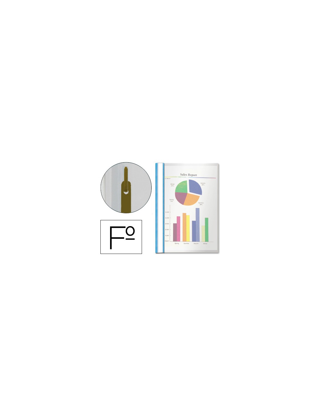 Fabricada en plàstic, amb fàstener metàl·lic, coberta transparent i posterior opaca, finestra amb tira de paper al llom per personalitzar el treball. Grandària foli. Tapa de 140 micres. Contratapa de 180 micres.