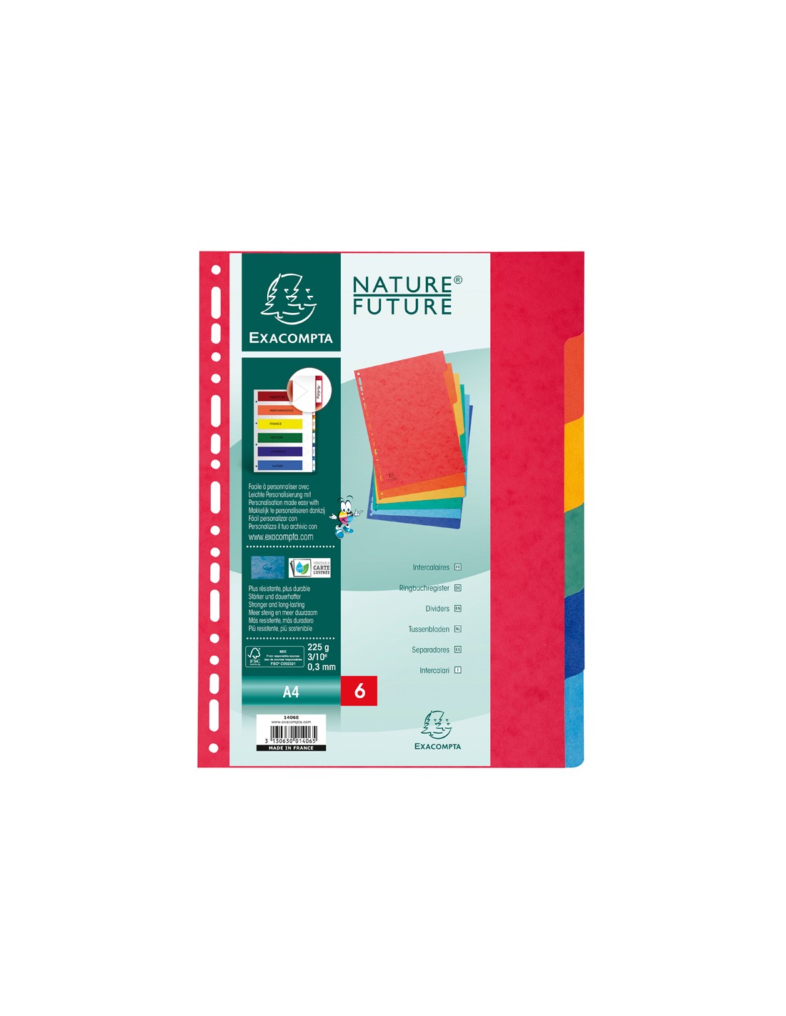 Joc de separadors fabricats en símil prespan de 225 g/m² en colors vius. Amb suau il·lustració. Molt resistents. Multitrepant. Inclou pàgina díndexs.