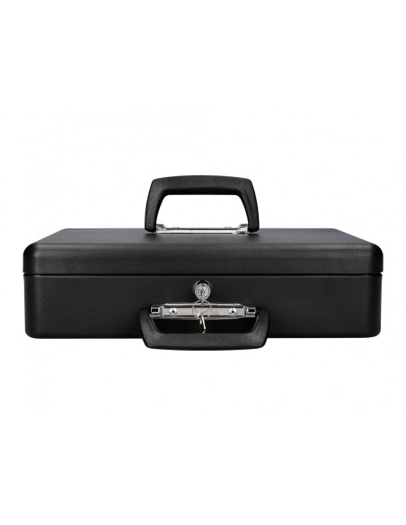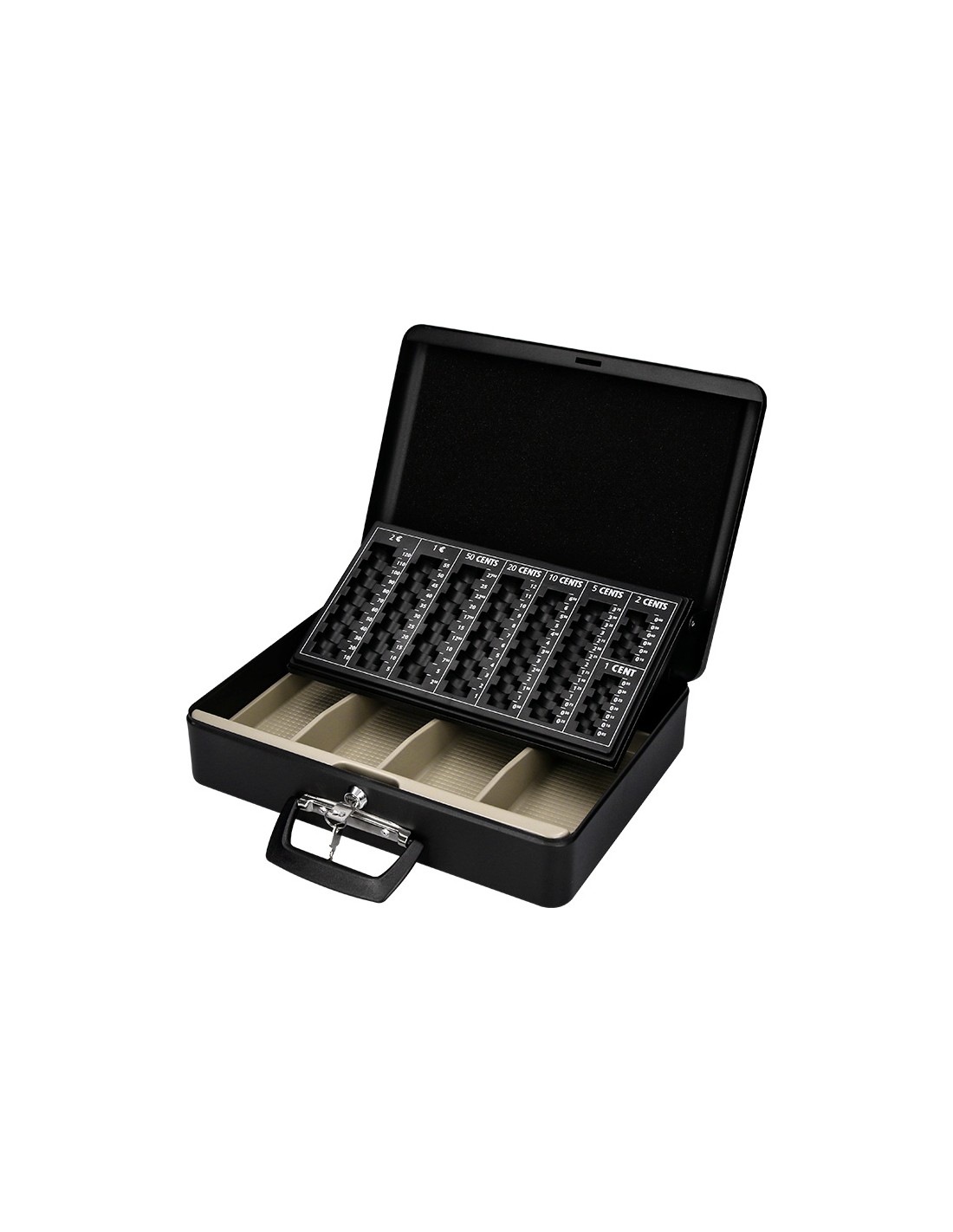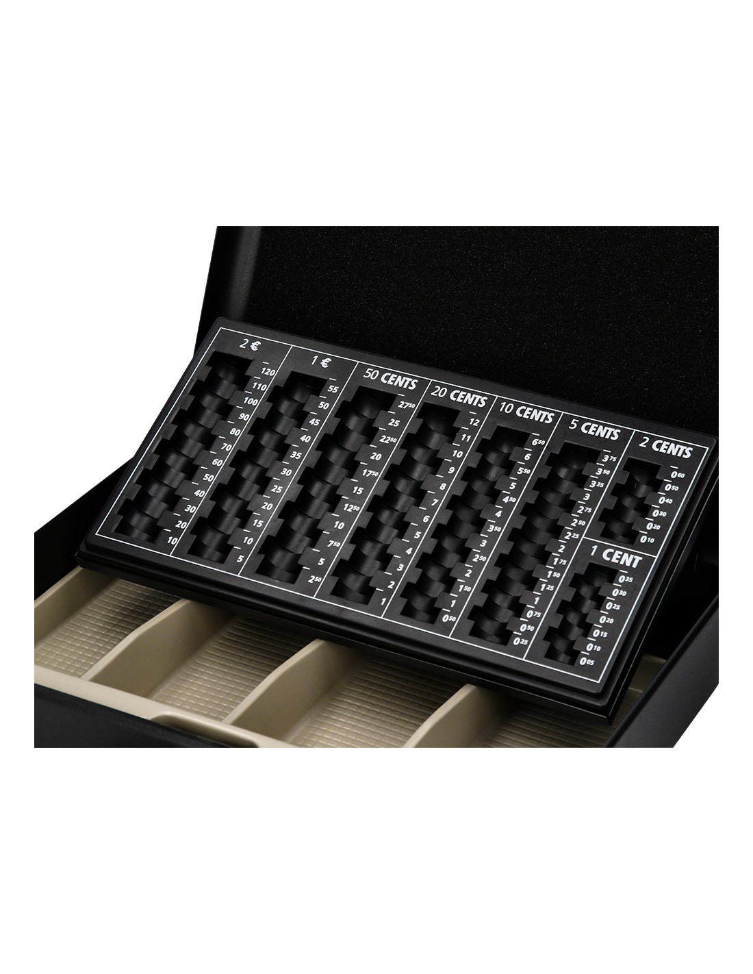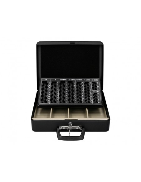 Estructura d´acer de 0,8 mm de gruix. Amb classificador per a monedes i bitllets d'euro. Inclou 2 jocs de claus. Color negre. Mides: 370 x 110 x 290 mm. Pes: 3,5 kg.