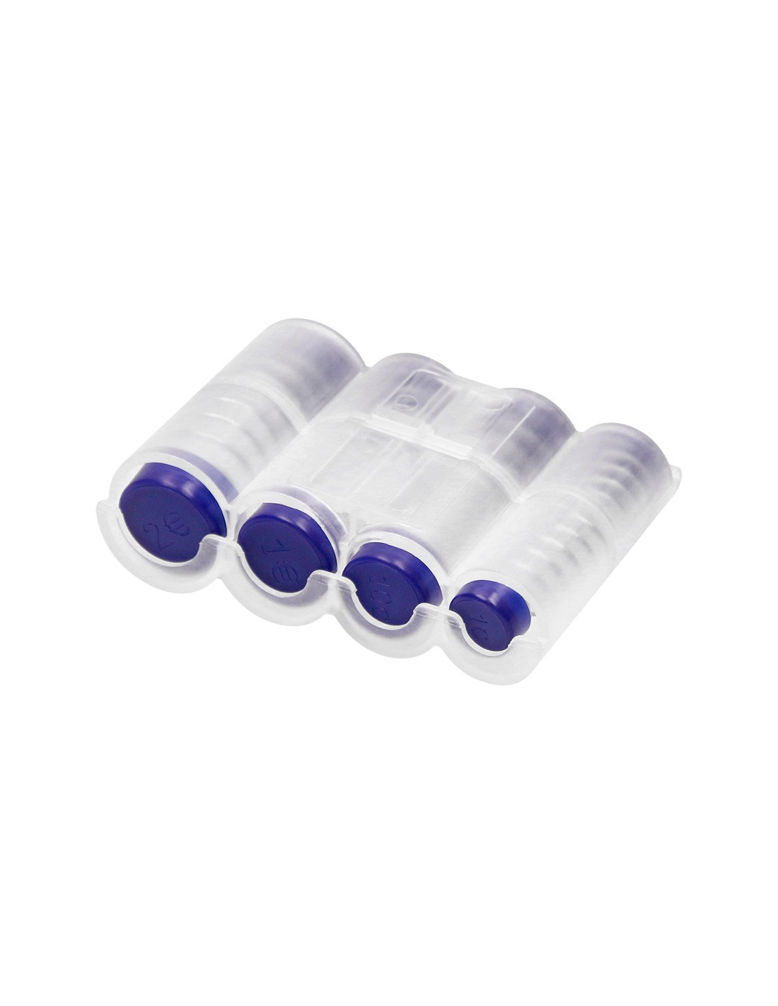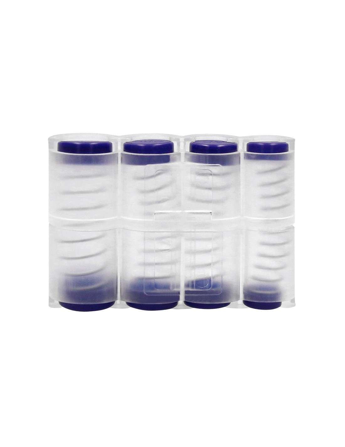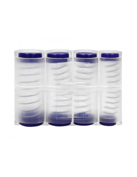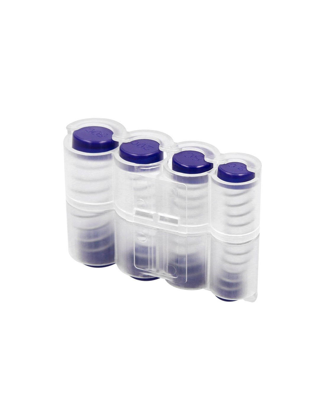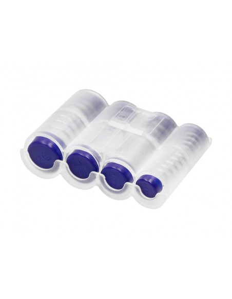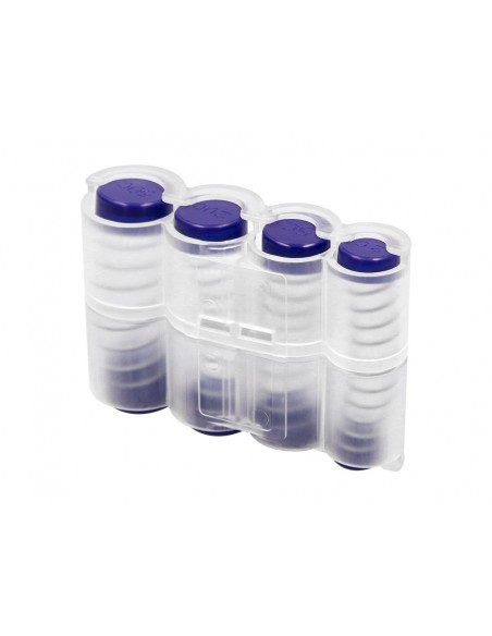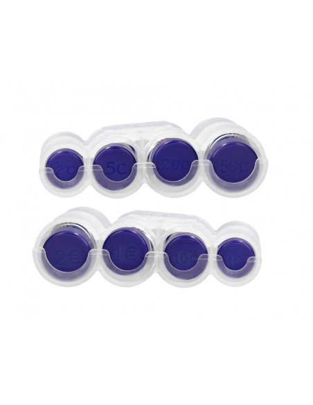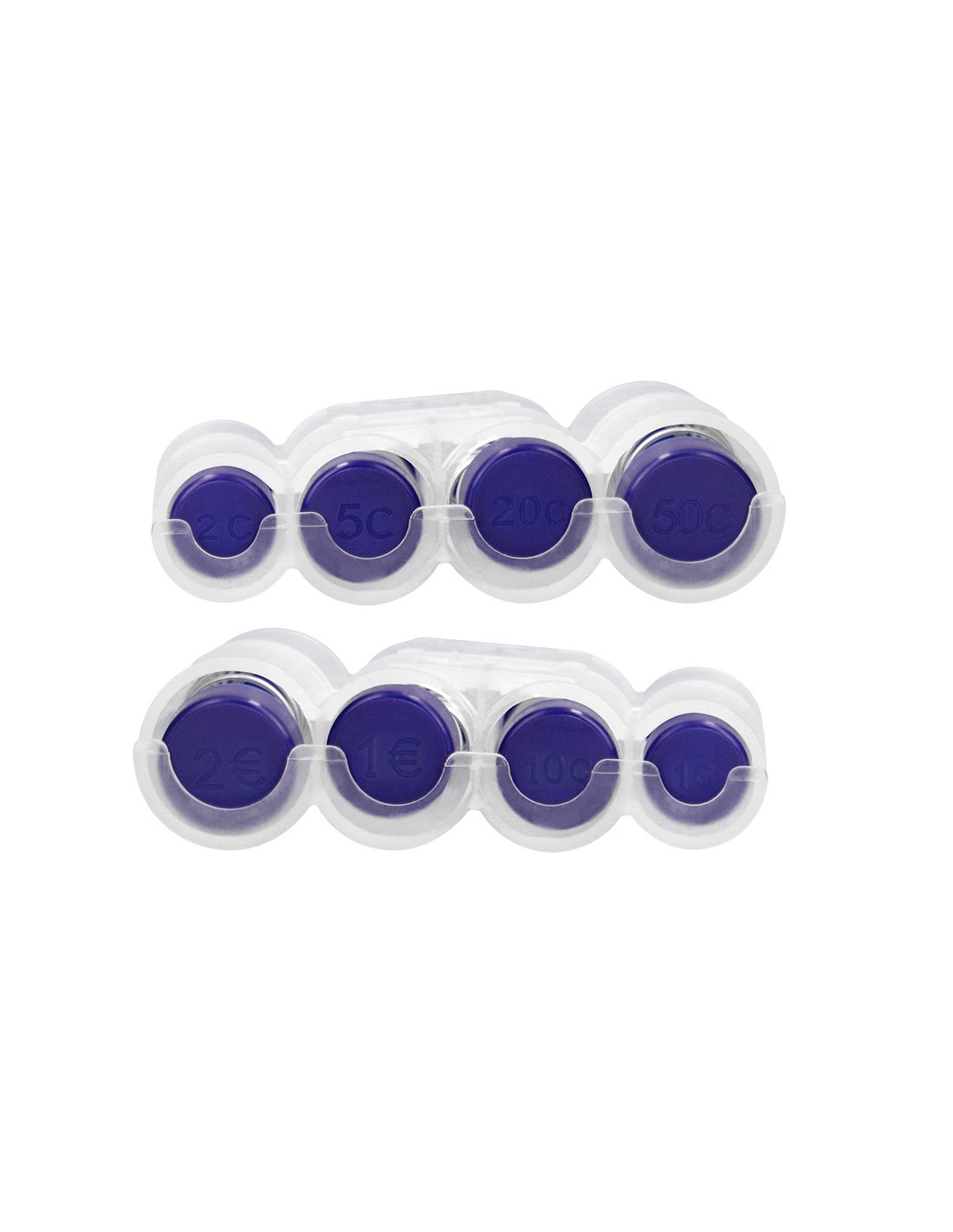 Portamonedes amb moll vàlid per a les 8 fraccions d'euro (monedes d'1, 2, 5, 10, 20 i 50 cèntims, 1 i 2). Ideal per a taxistes, quioscos de premsa, quioscos de l'ONCE, cambrers, aparcacotxes, etc. Color transparent i blau. Mides: 75 x 105 x 32 mm.