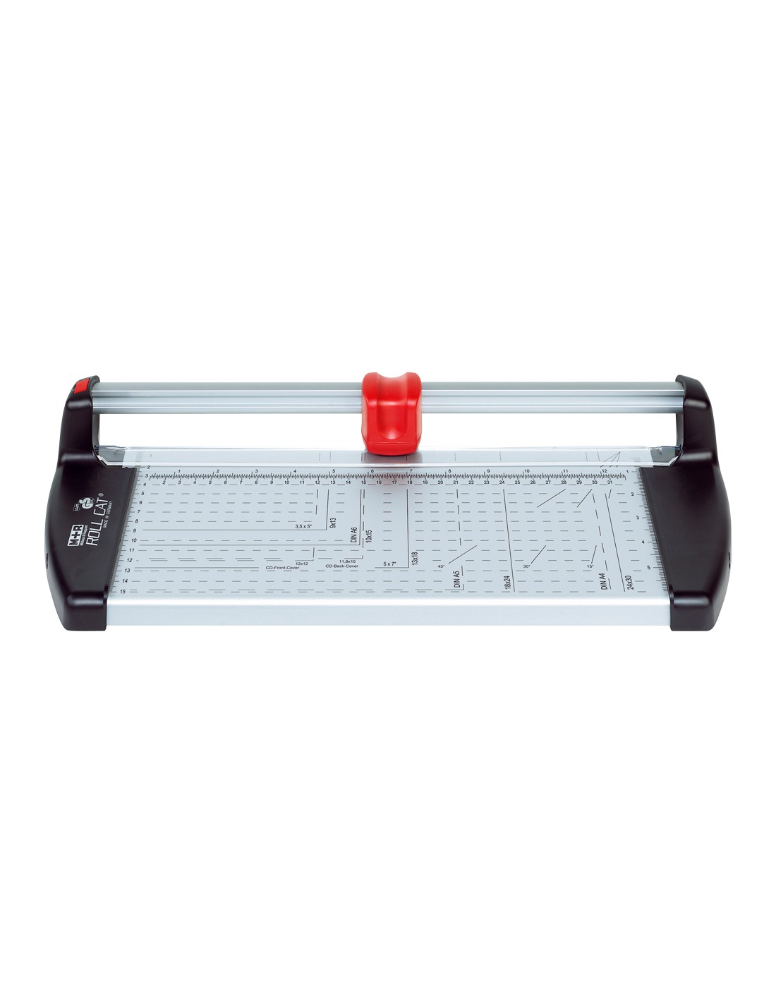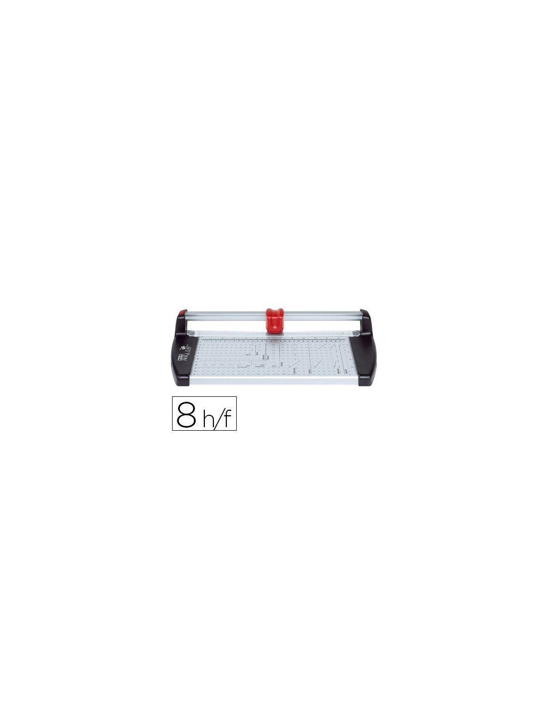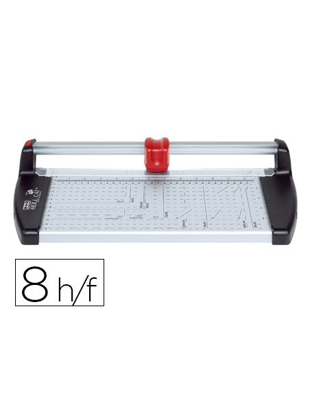 Màquina talladora amb base dalumini. Robusta i amb mides gravades en centímetres, polzades i resta de formats habituals. Fulla inferior i superior (rodant) en acer temperat amb capçal tallant ergonòmic. Capçal de seguretat que protegeix la fulla fàcil de
