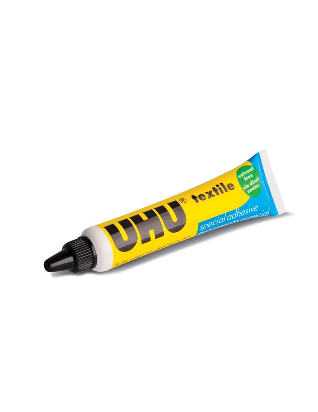 Cola especial sense dissolvents per enganxar cotó, teixits amb cotó, tela texana, cordes, feltre i fibres de coco entre si oa fusta i cuir. El cola especial UHU TÈXTIL blanc es torna transparent quan s'endureix, és molt flexible, es pot rentar a 90°C i es