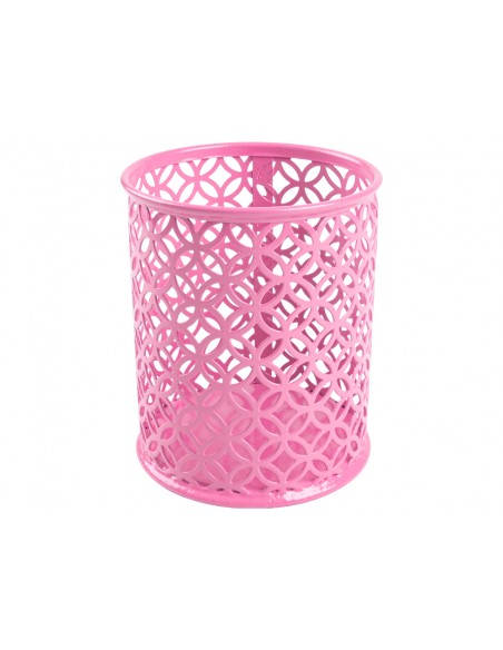 Cubilet rodó de metall amb disseny de reixeta en cercles. Perfecte per allotjar llapis, retoladors, bolígrafs. No inclou accessoris. Mides: Ø 80 x 100 mm.