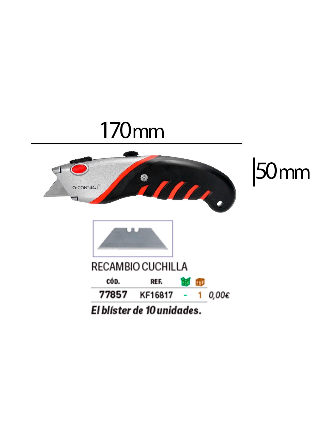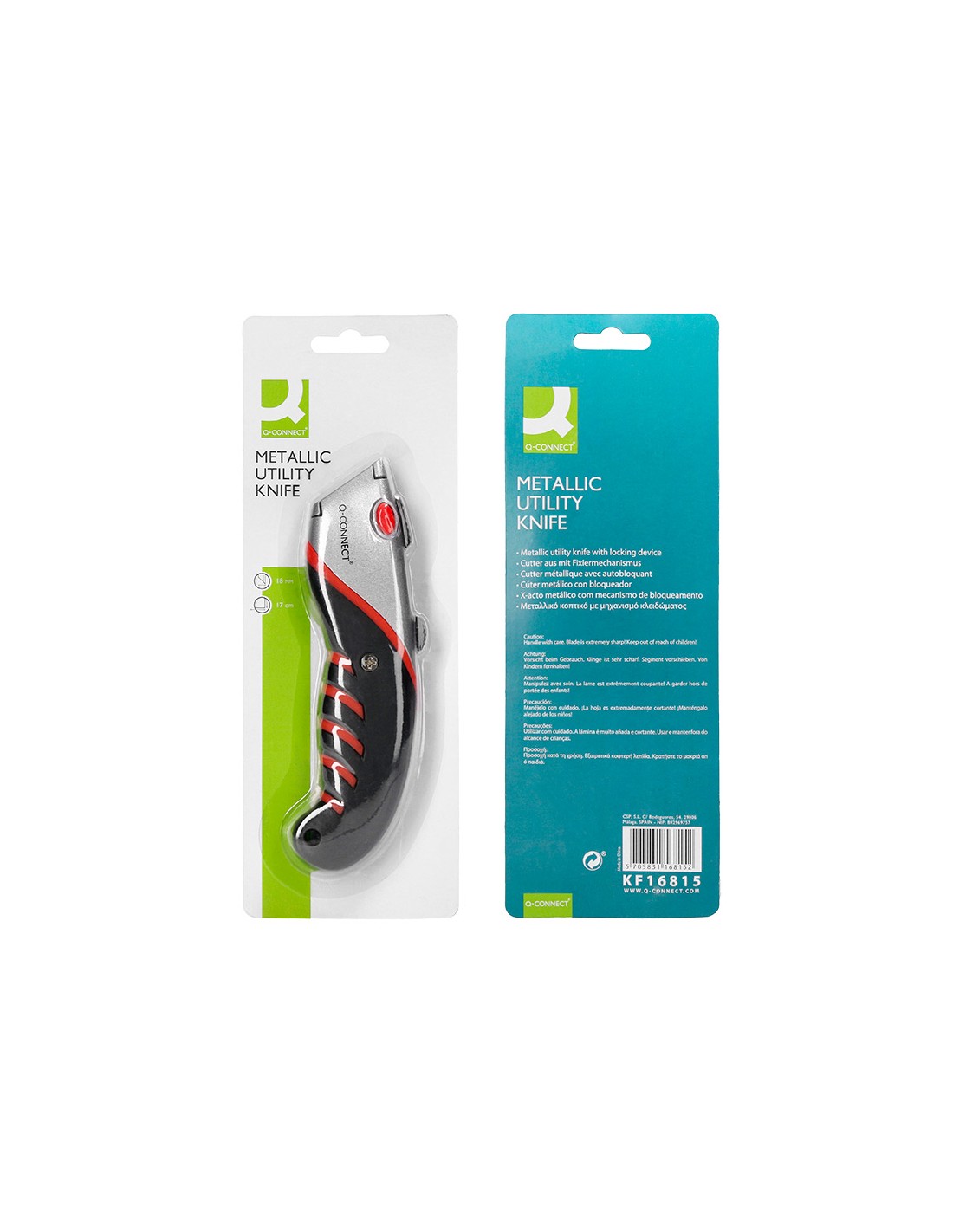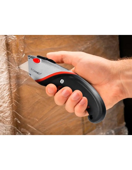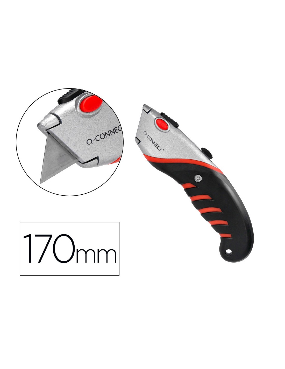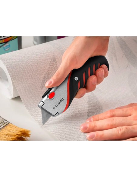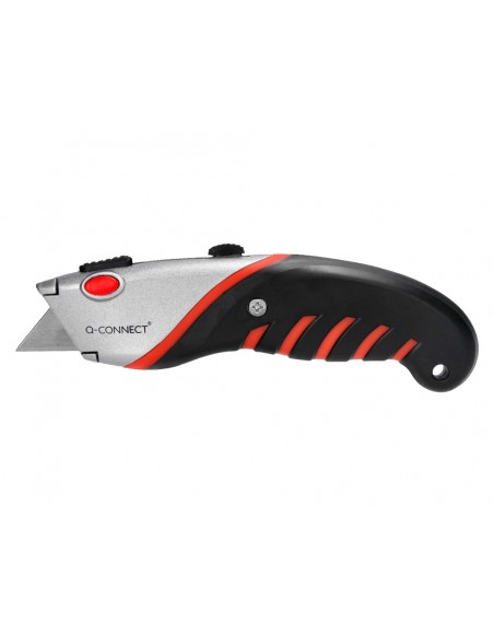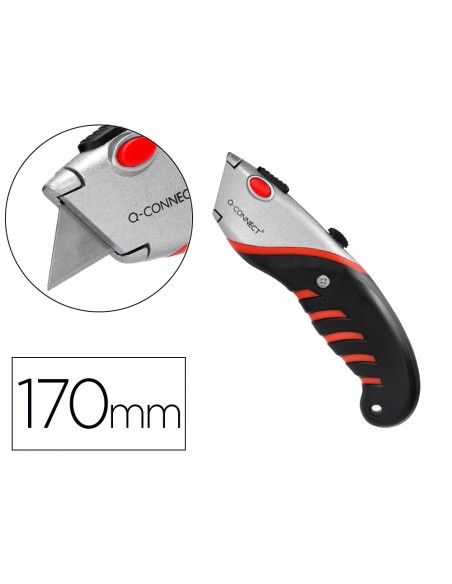 Retràctil i intercanviable. Amb fre de seguretat. Amb mànec de cautxú per a més comoditat d',ús. Color negre, gris i vermell. Fulla de 18 mm d',amplada. Longitud: 170 mm. El blíster de 1 unitat.