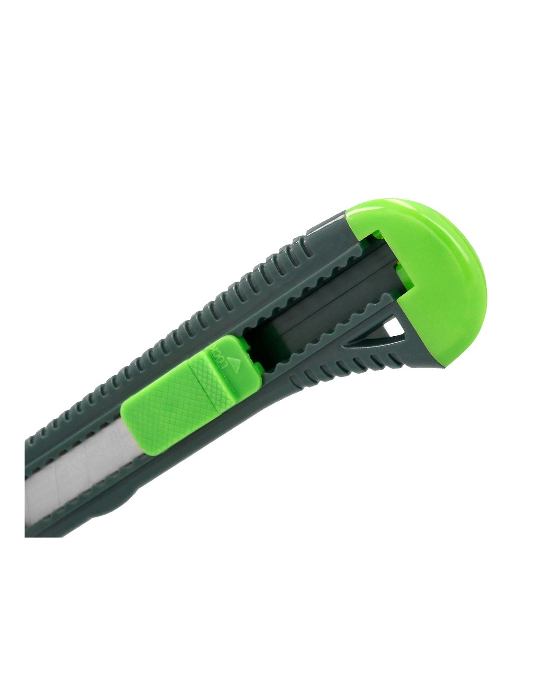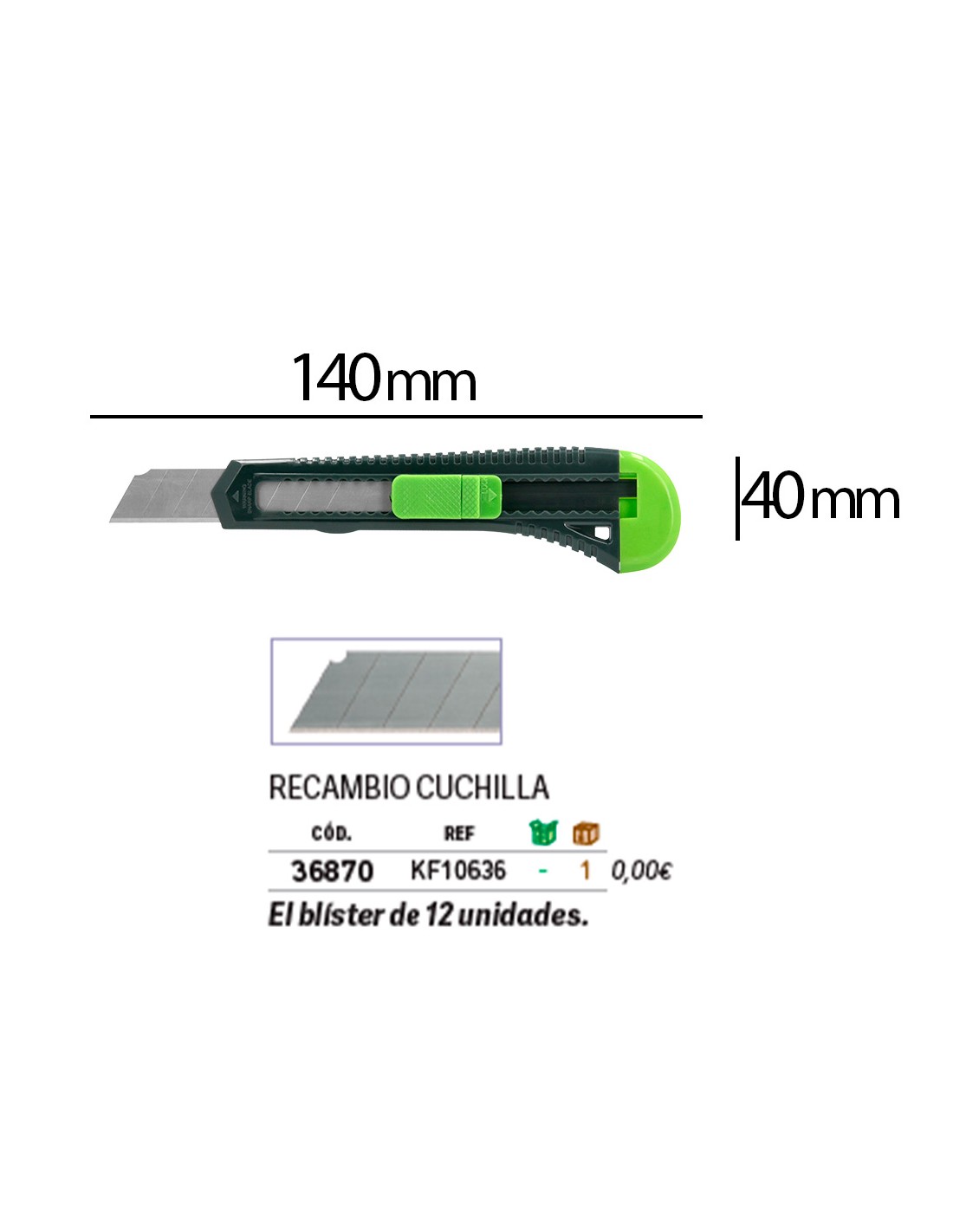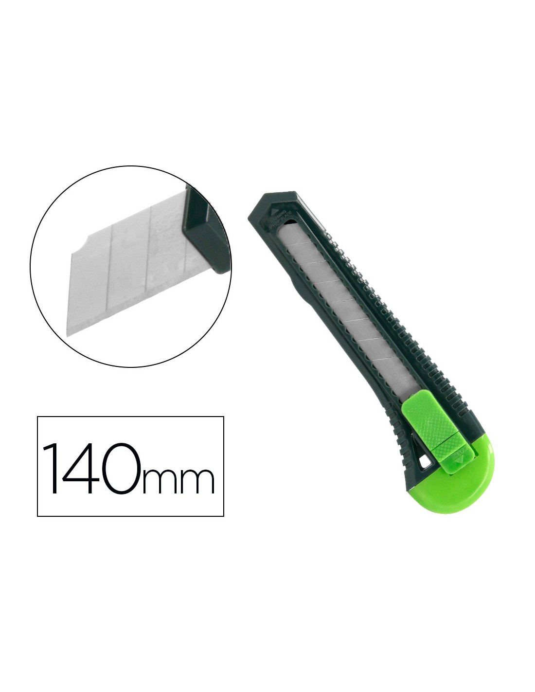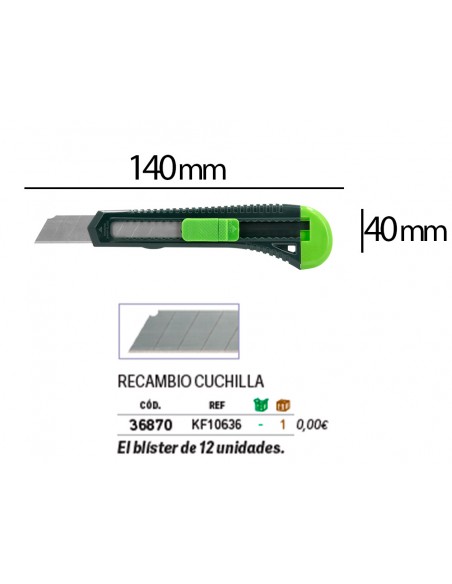 Retràctil i intercanviable. Fulla d',acer pretallat i fre de seguretat. Fulla de 18 mm d',amplada. Longitud 140 mm. El blíster de 1 unitat.