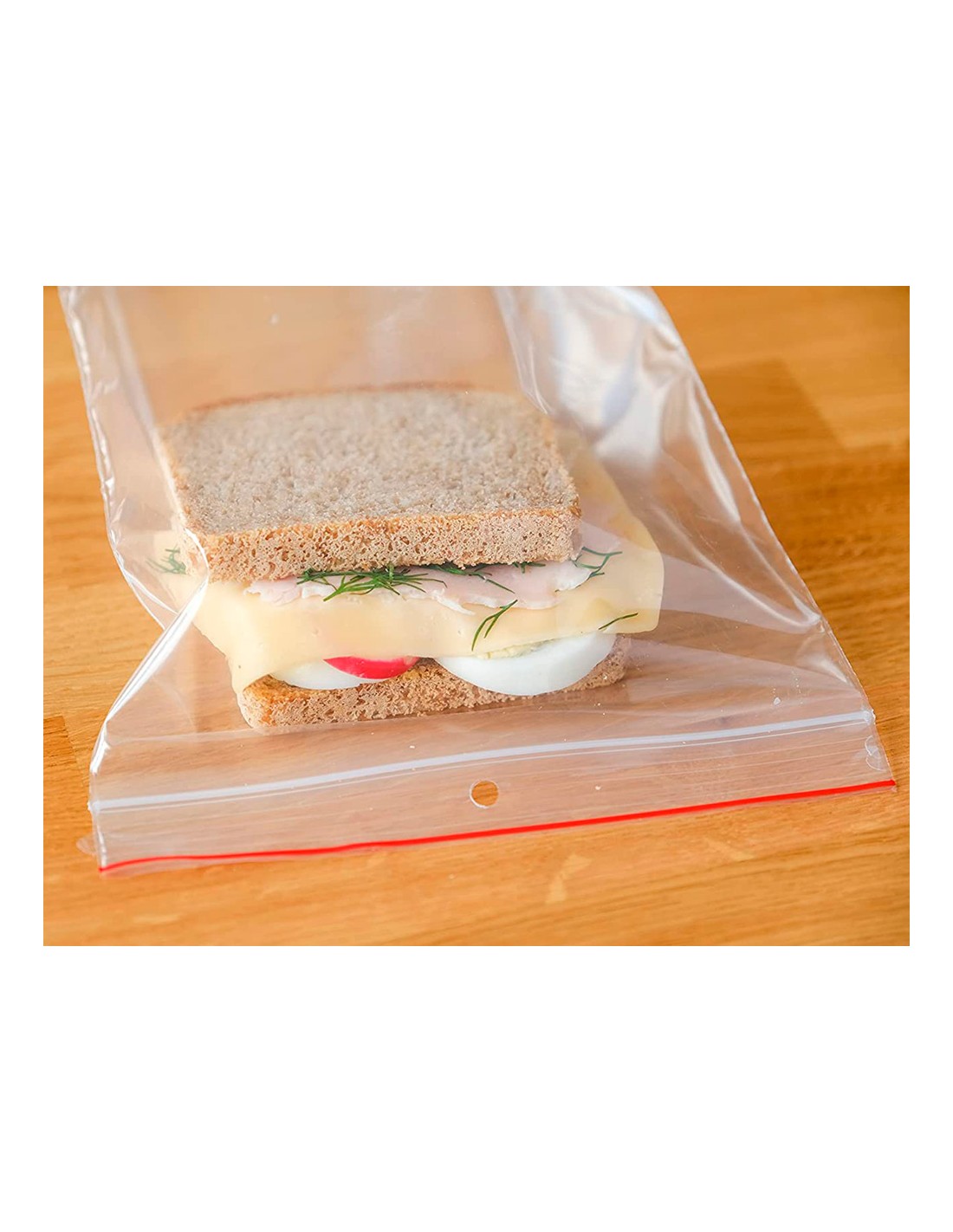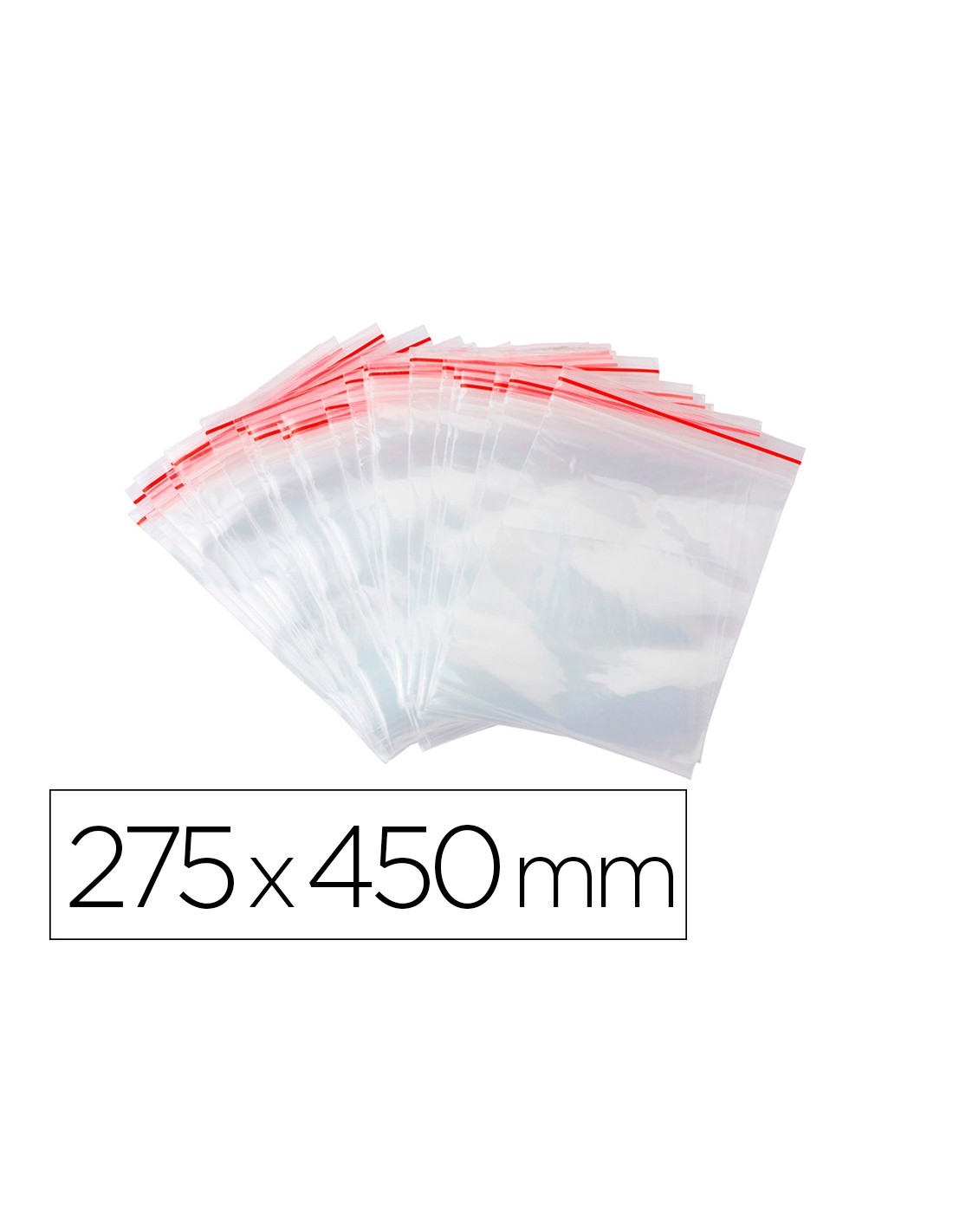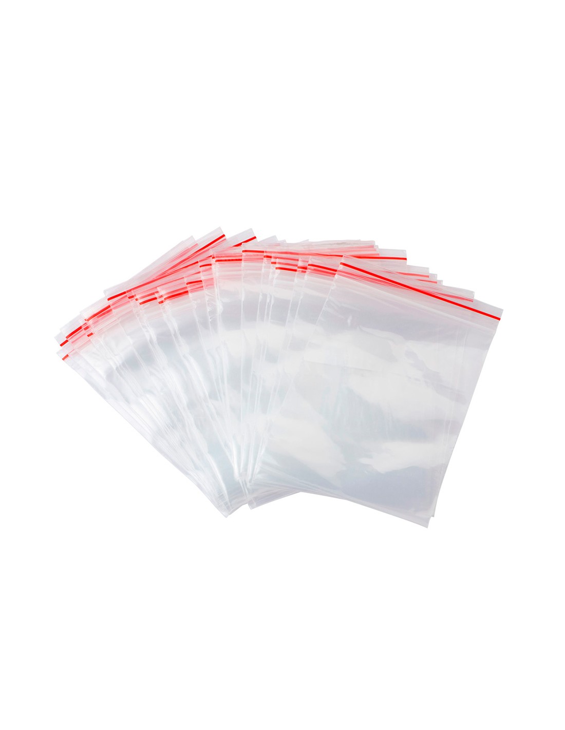 Bosses fabricades en plàstic amb sistema d',autotancament per pressió fàcils de tornar a segellar. Color transparent amb una línia vermella i una perforació de 6 mm sobre el segell. Ideals per emmagatzemar petits subministraments doficina o fins i tot aliments. Grossor 50 micres.