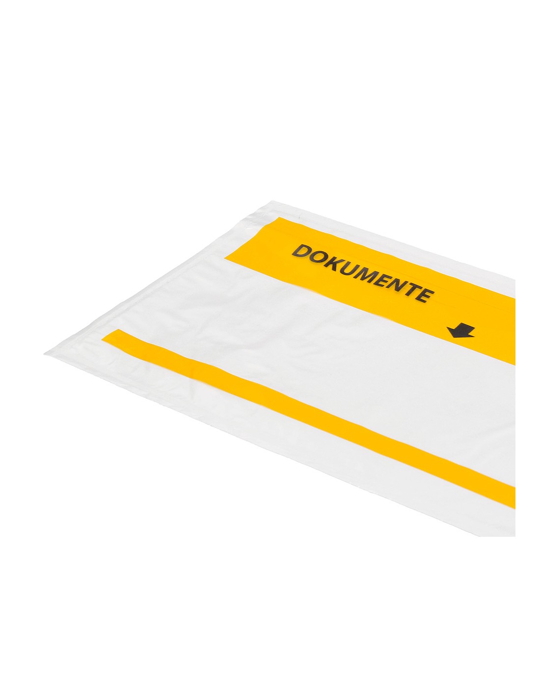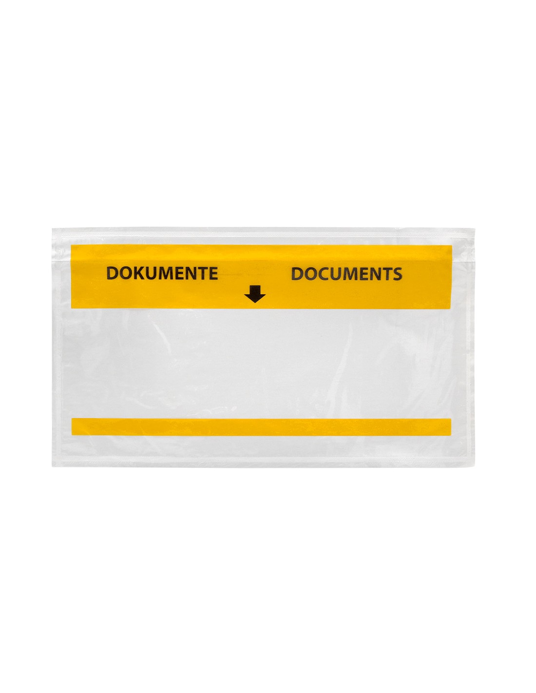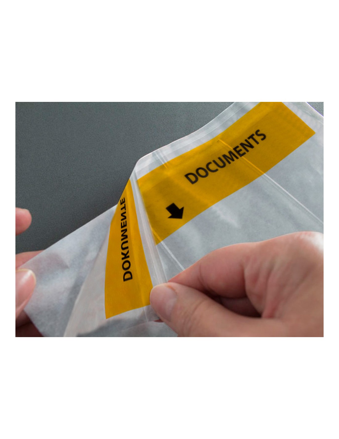 Sobre autoadhesiu per enviar documents. Text en anglès i alemany. Totalment transparent, sense finestra, amb impressió negre i groc.