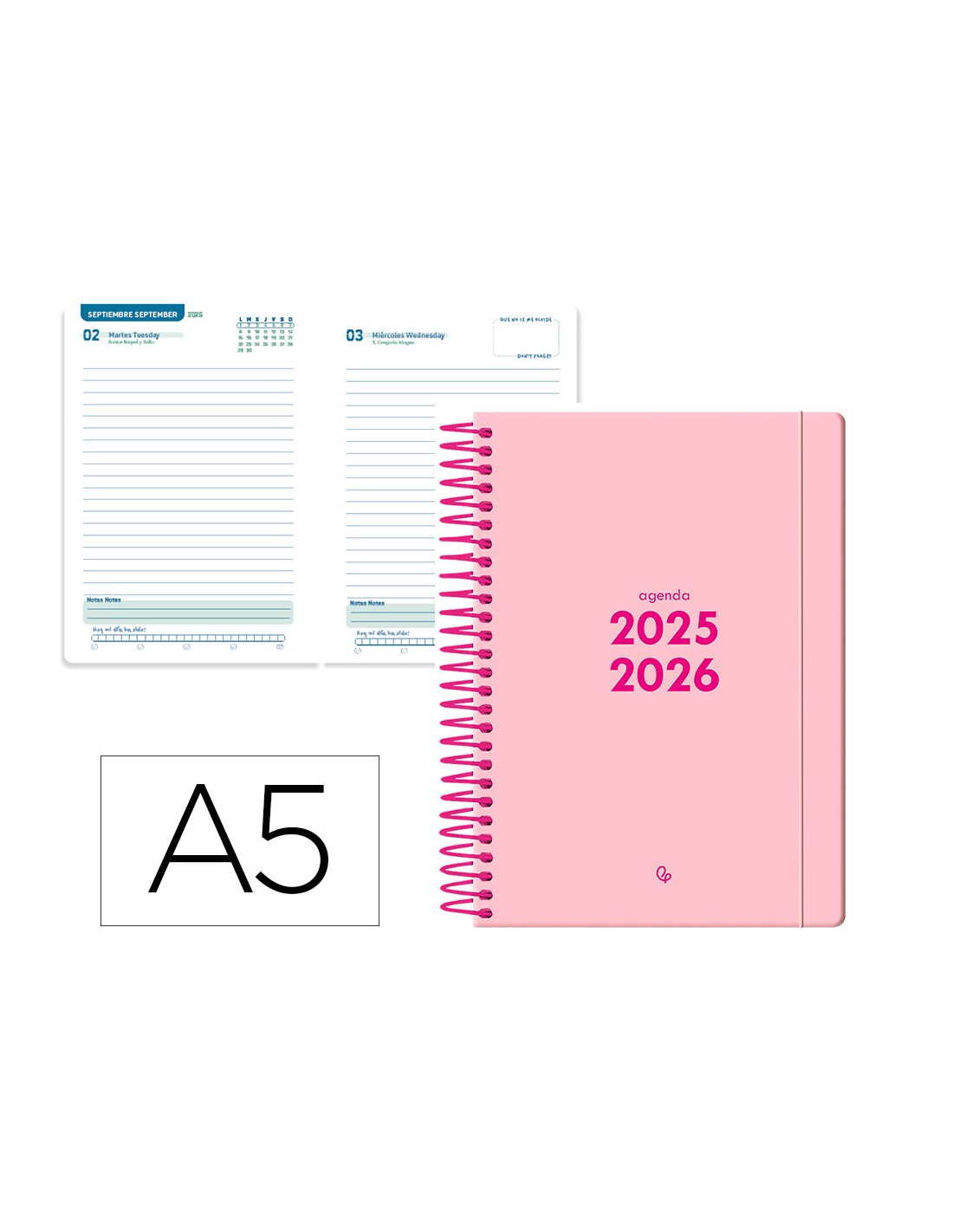 Agenda escolar liderpapel 25-26 espiral basic rosa dia pàgina a5 bilingüe paper fsc 70 gr