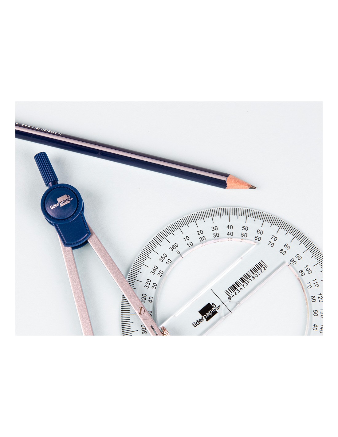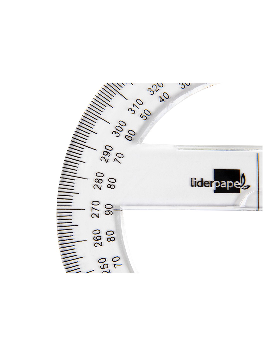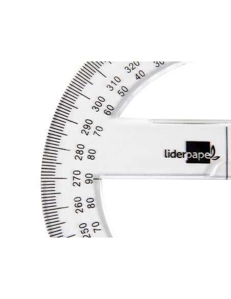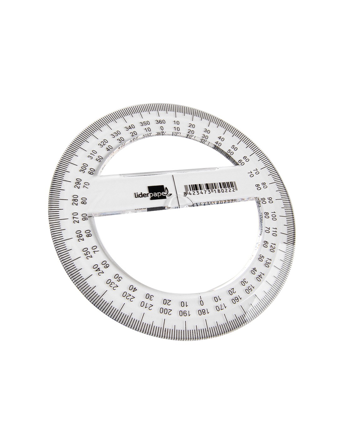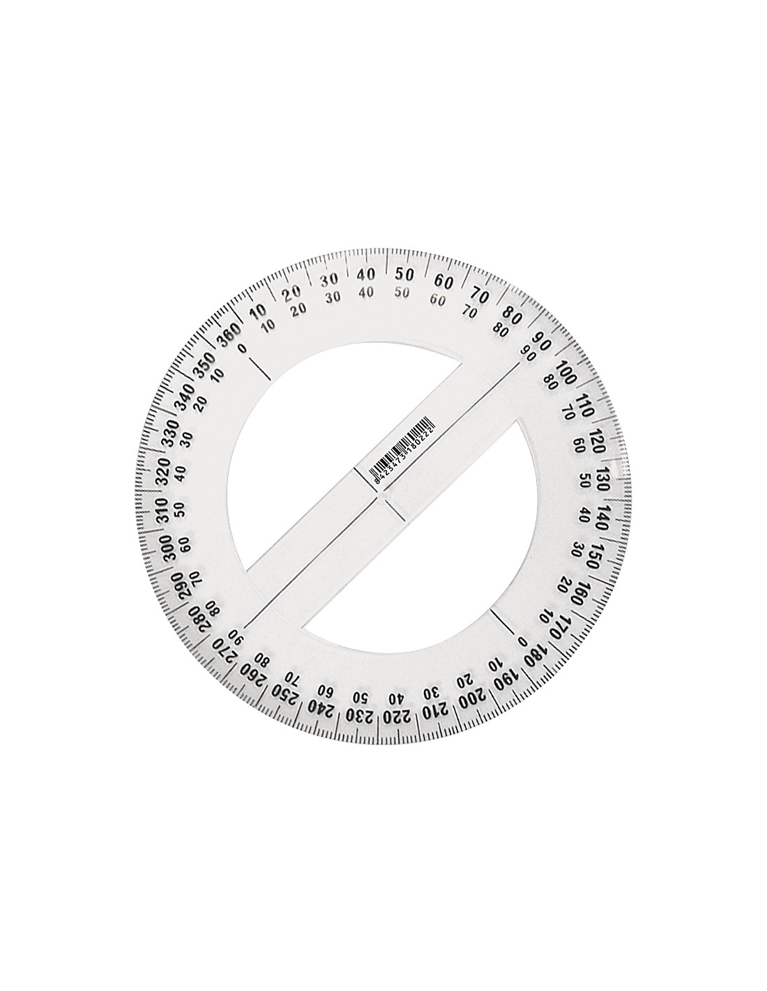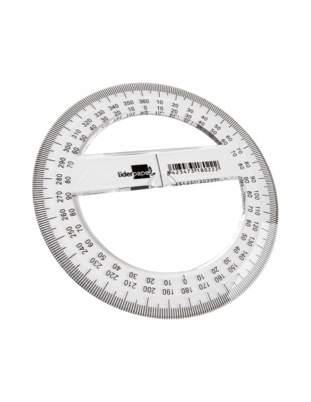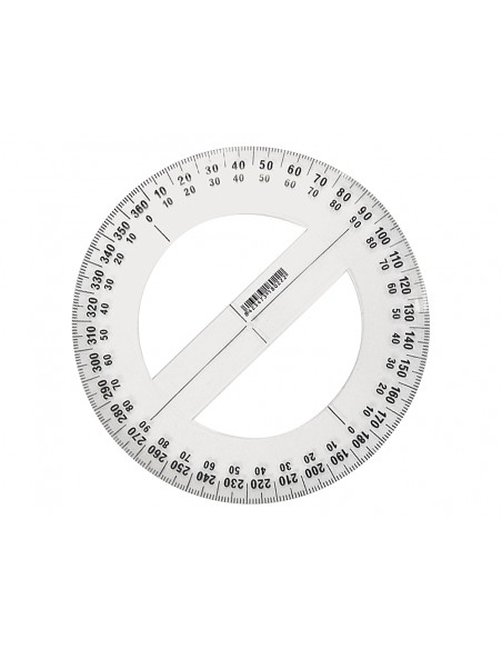 Fabricat amb plàstic vidre transparent. Conté escala de 0° a 360°. Diàmetre de 100 mm.