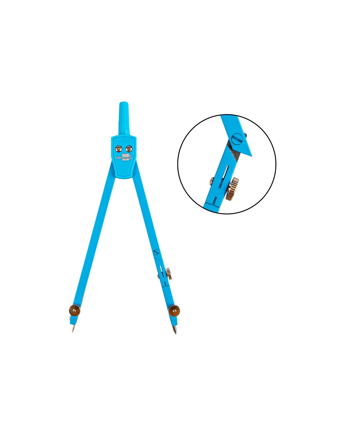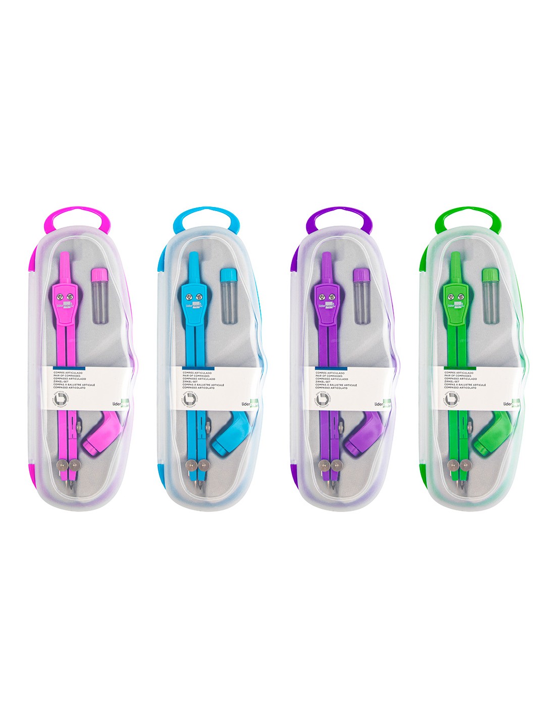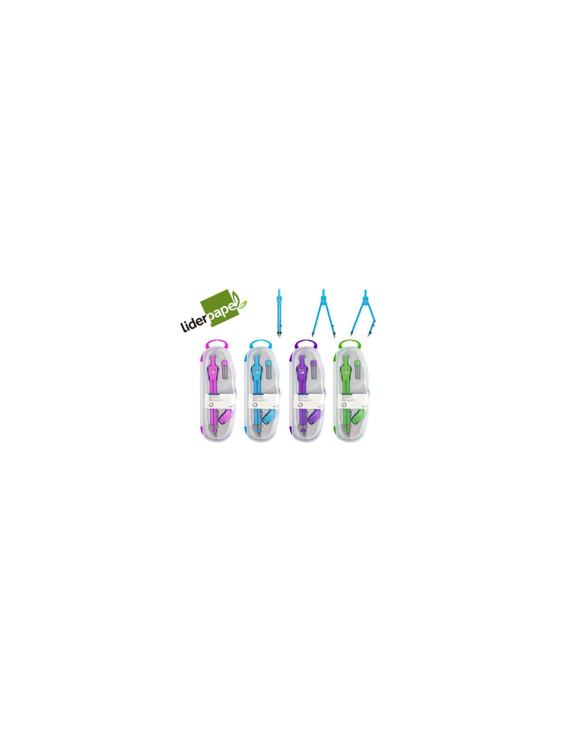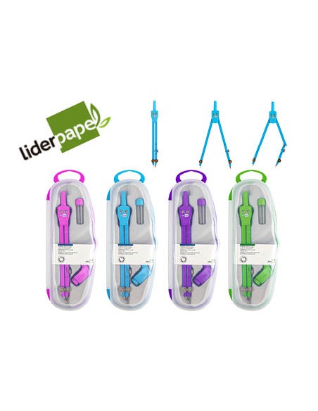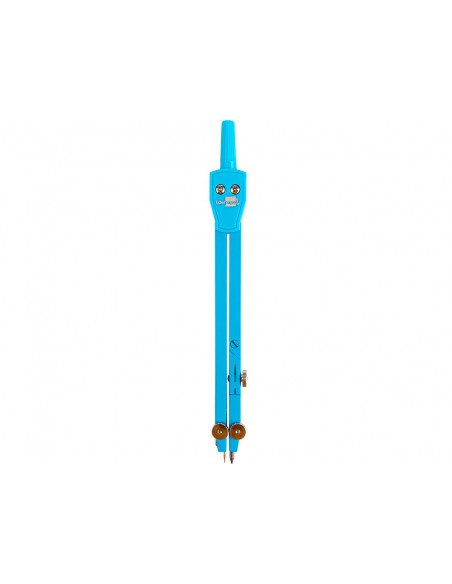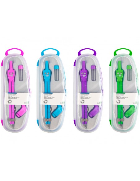 Compàs articulat en un braç amb estoig de mines de 2 mm i adaptador de rosca. Colors assortits blau, rosa, verd i violeta. Longitud 14 cm. Circumferència 38 cm.