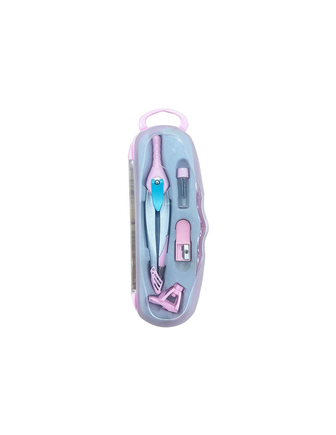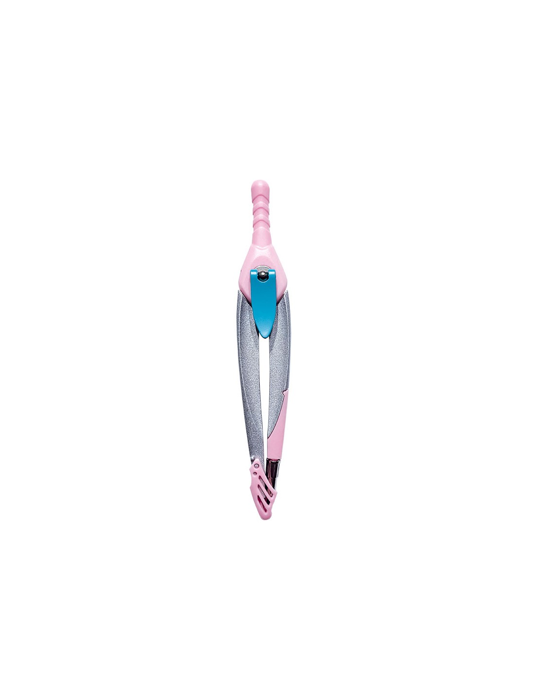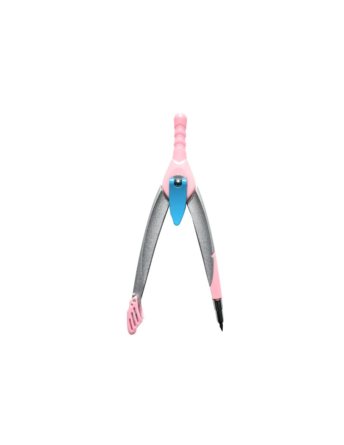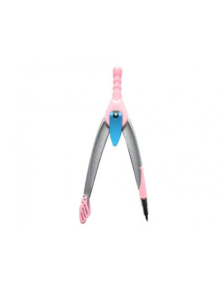 Compàs amb sistema de bloqueig dels braços per traçar els cercles. Conté abraçadora universal i tub de mines. Amb protector de punta. Color Rosa Clar.