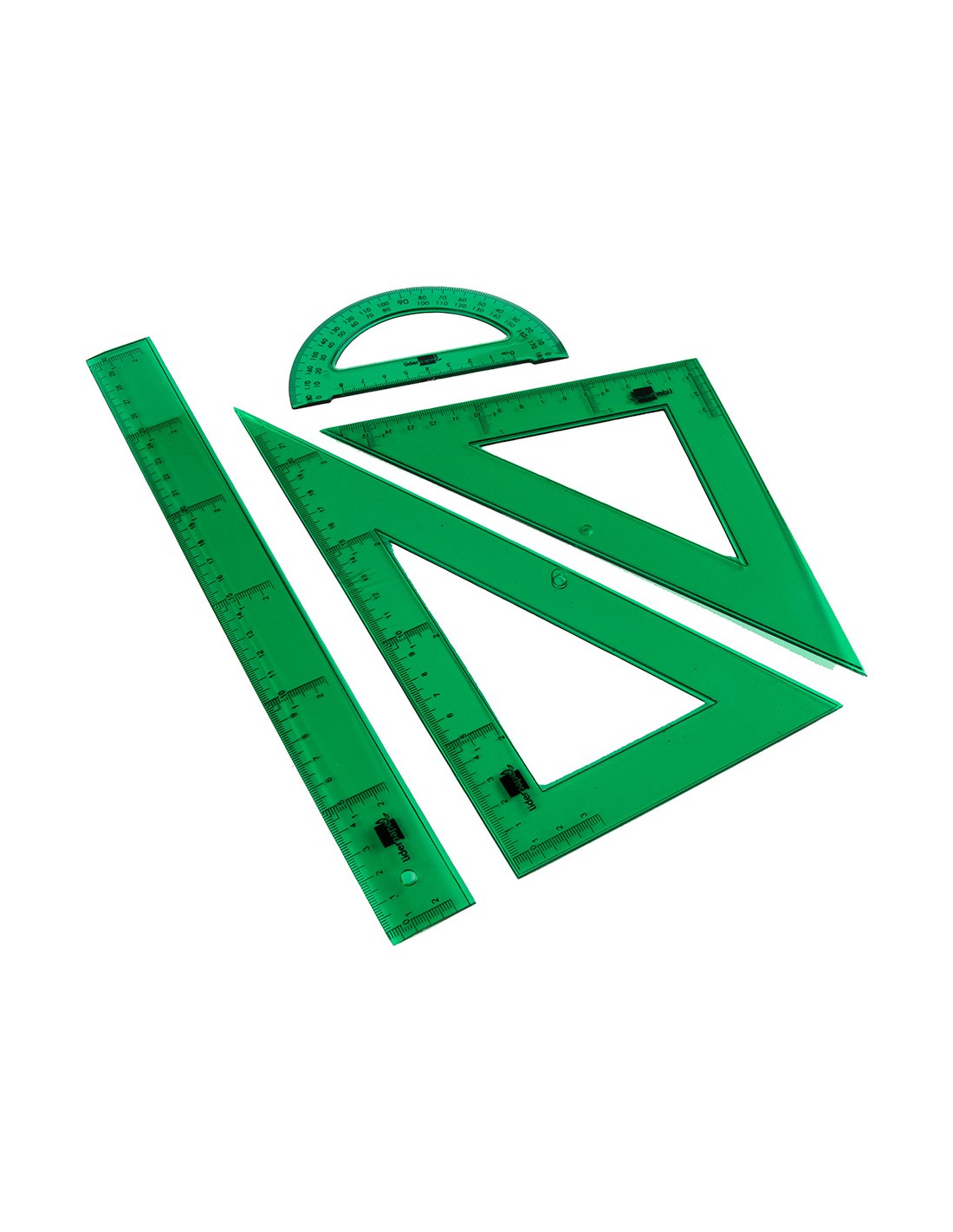 Petaca plàstica transparent amb regle de 30 cm bisellada, esquadra de 25 cm (45°), cartabó de 25 cm (60°) i semicercle de 15 cm (180°). Fabricats en acrílic verd. Amb graduació.