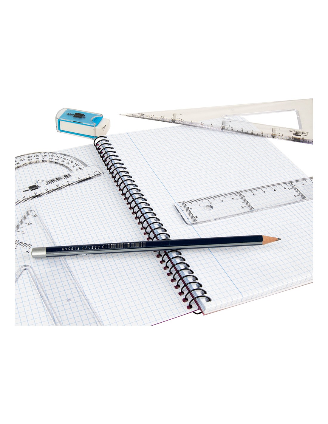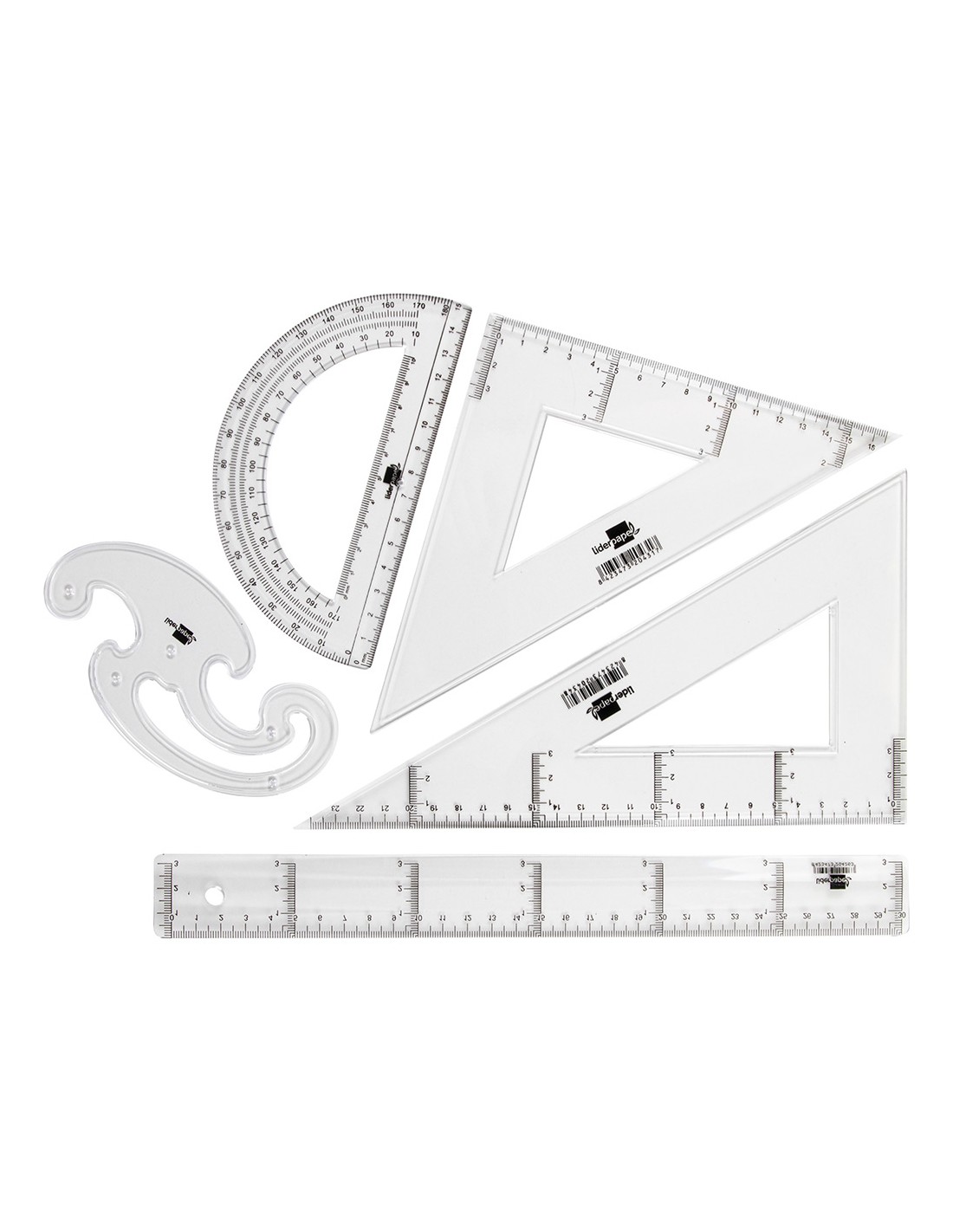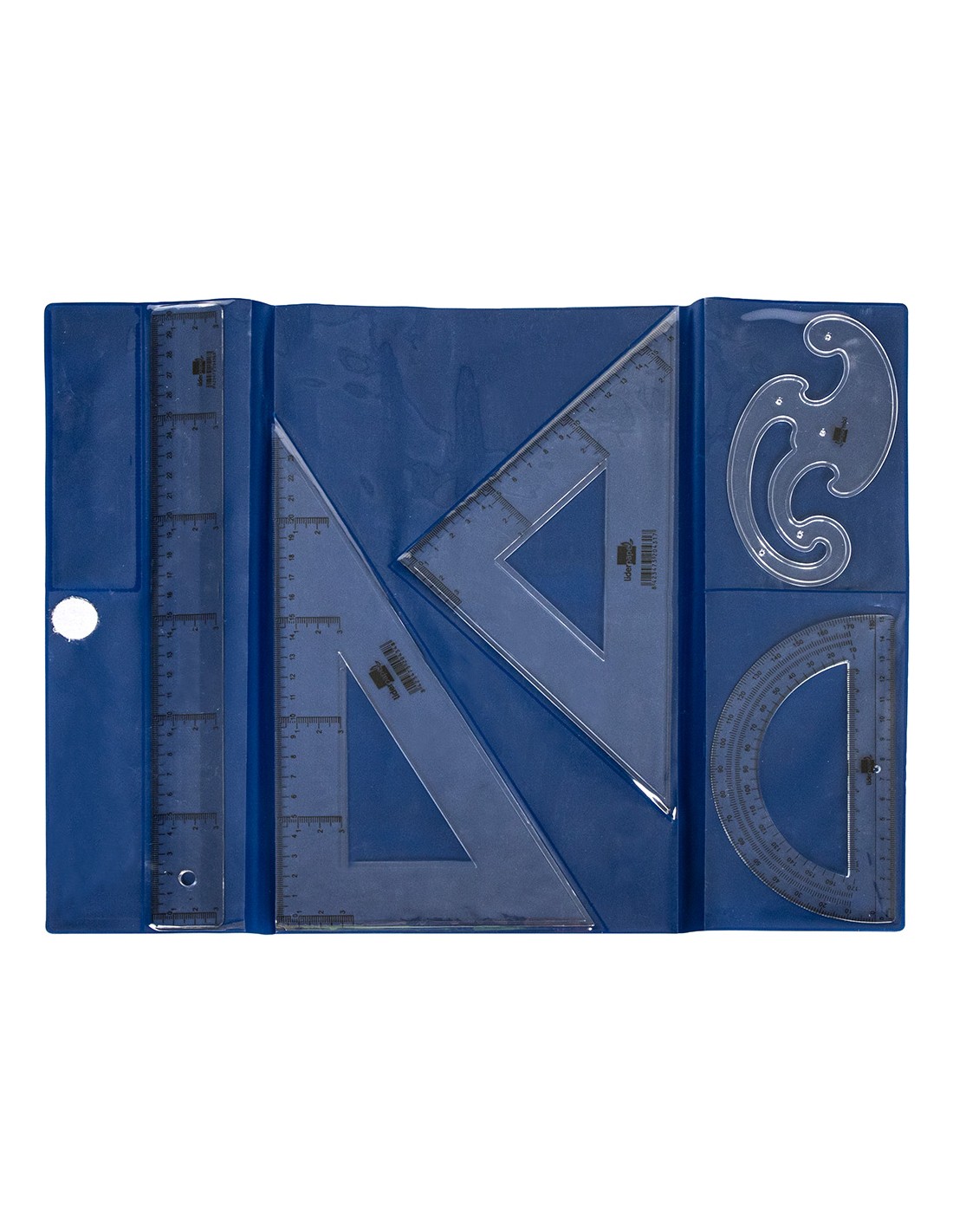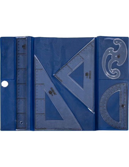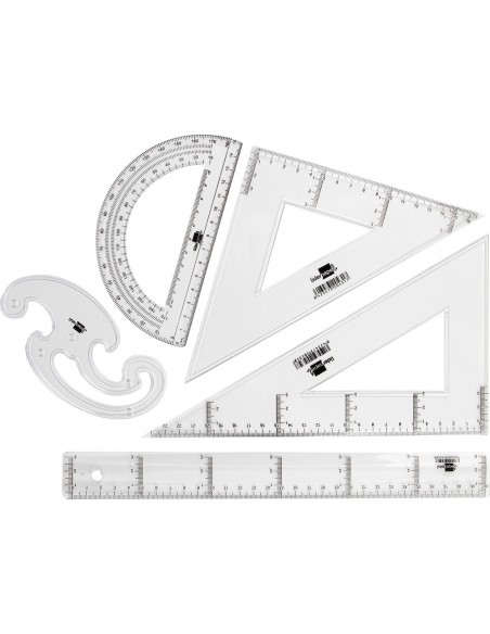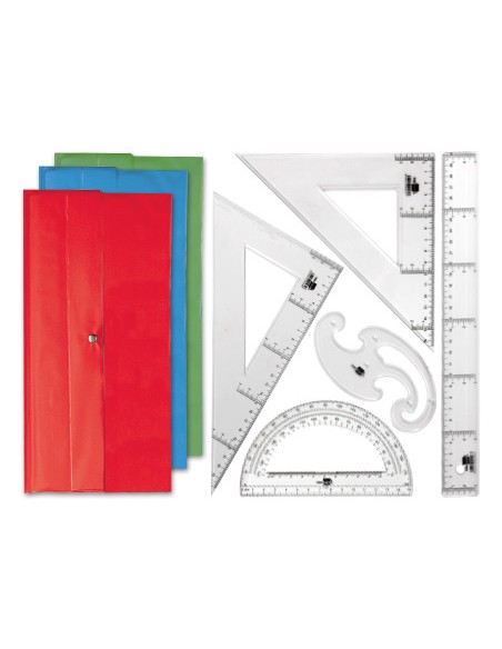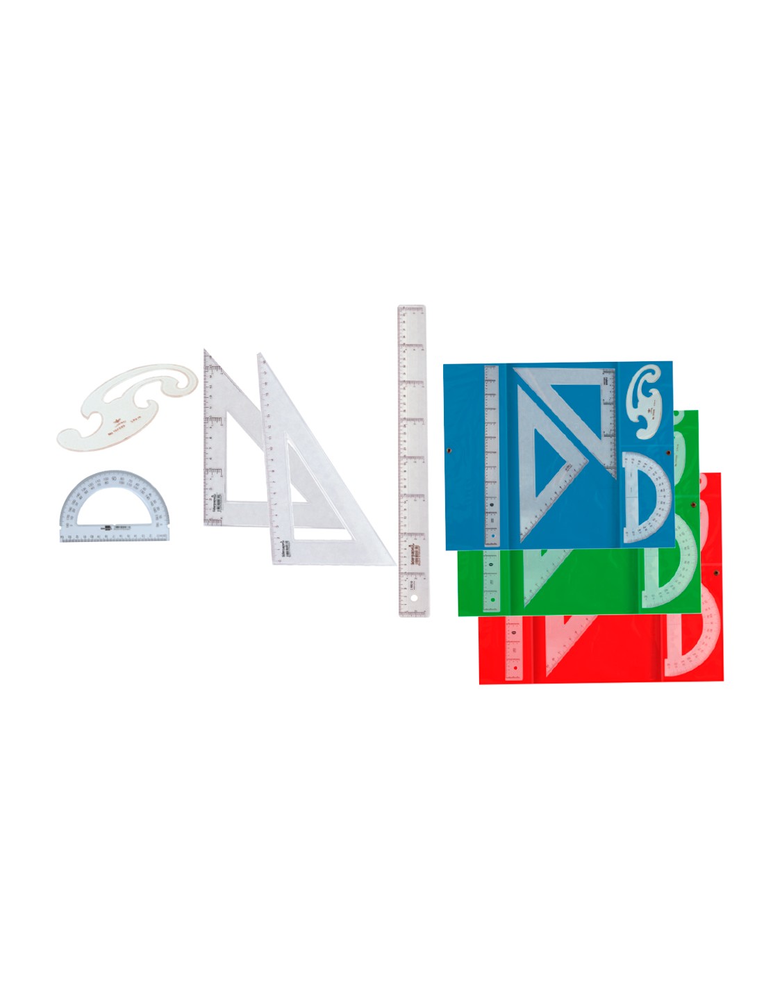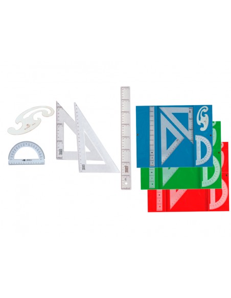 Petaca plàstica transparent i verda amb regle de 30 cm, escaire de 25 cm, cartabó de 25 cm, semicercle de 15 cm (180°) i plantilla de corbes. Transparents, bisellats i graduats en mil·límetres. Amb tancament de fermall.