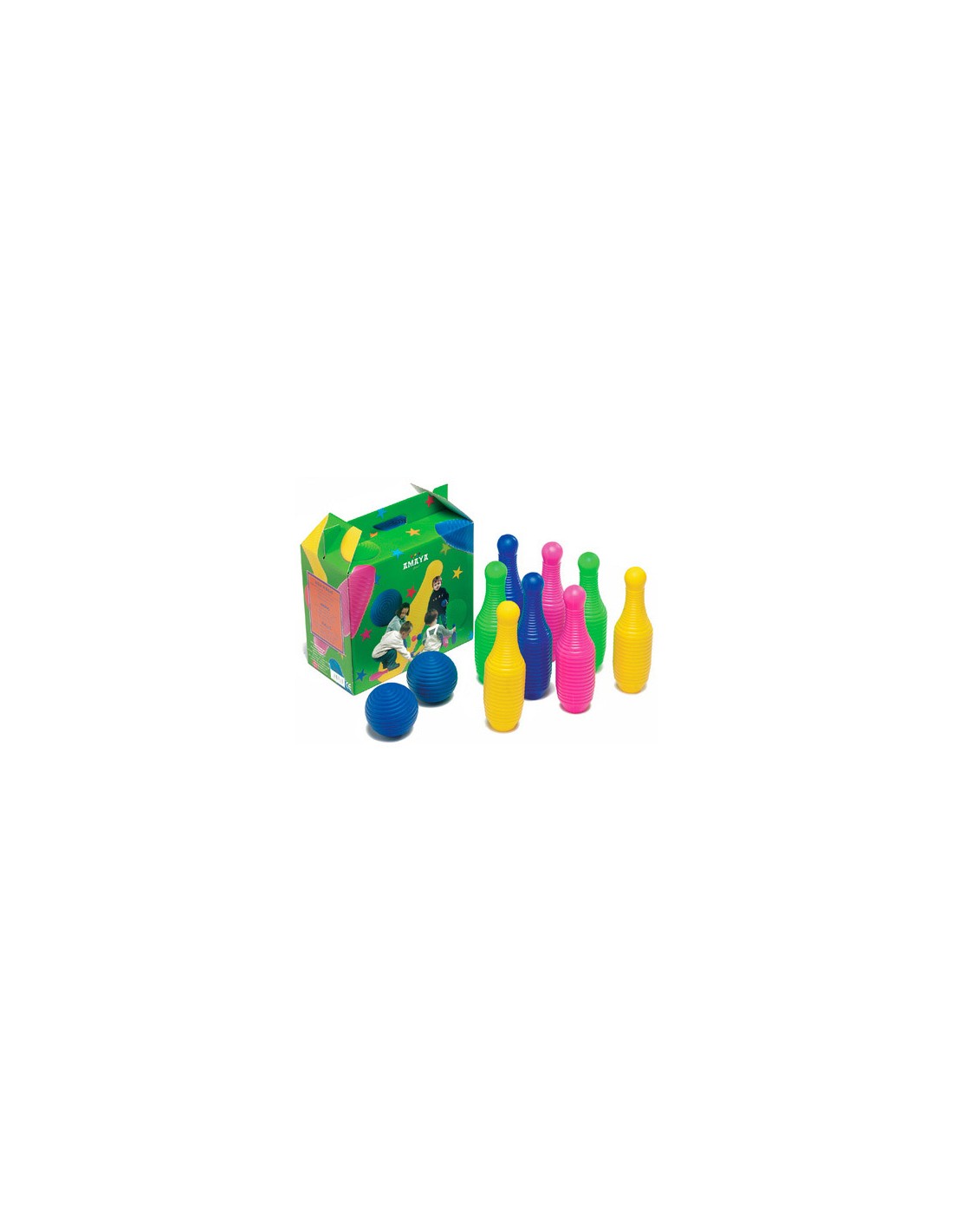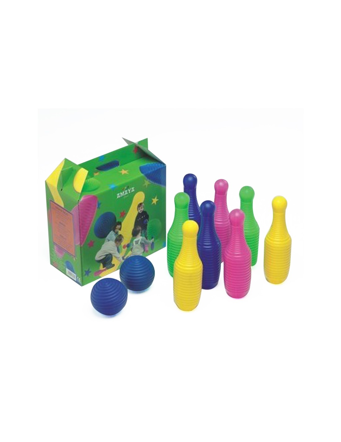 Joc bitlles polietilè. Fabricat amb P.E. Set de 8 bitlles i dues pilotes. Alçada bolo: 26 cm. Diàmetre pilota: 9.5. Colors: fúcsia, verd, groc, blau. Presentat en una caixa de cartró rígid per facilitar-ne l'emmagatzematge. Compleixen normativa europea de