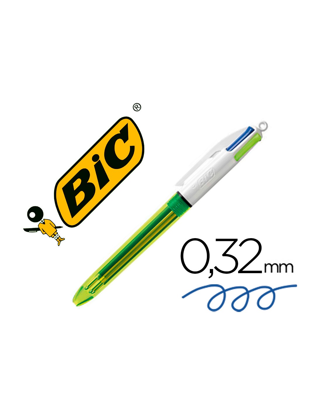 Bolígraf retràctil 4 en 1. Amb 3 puntes de mida mitjana amb tinta blava, negra, vermella i 1 punta gruixuda de color groc per ressaltar. Cos transparent que permet veure el nivell de tinta. Punta mitjana de 1 mm. Traç: 0,32 mm. Punta gruixuda groga: 1,6 m