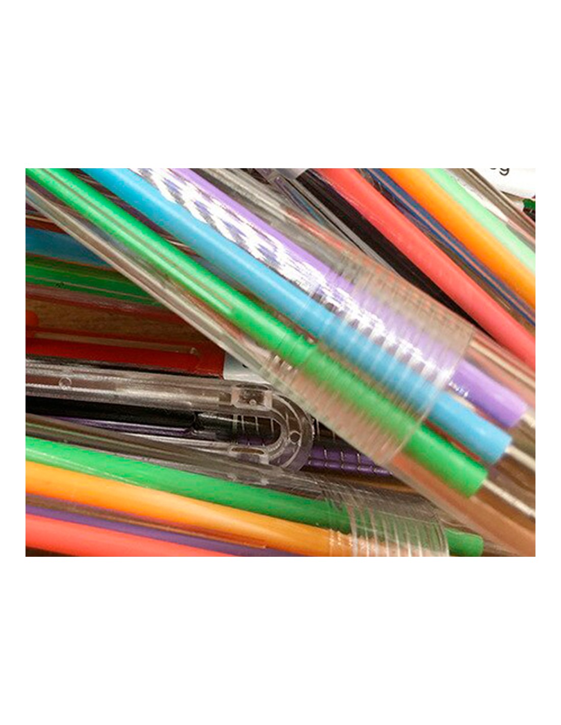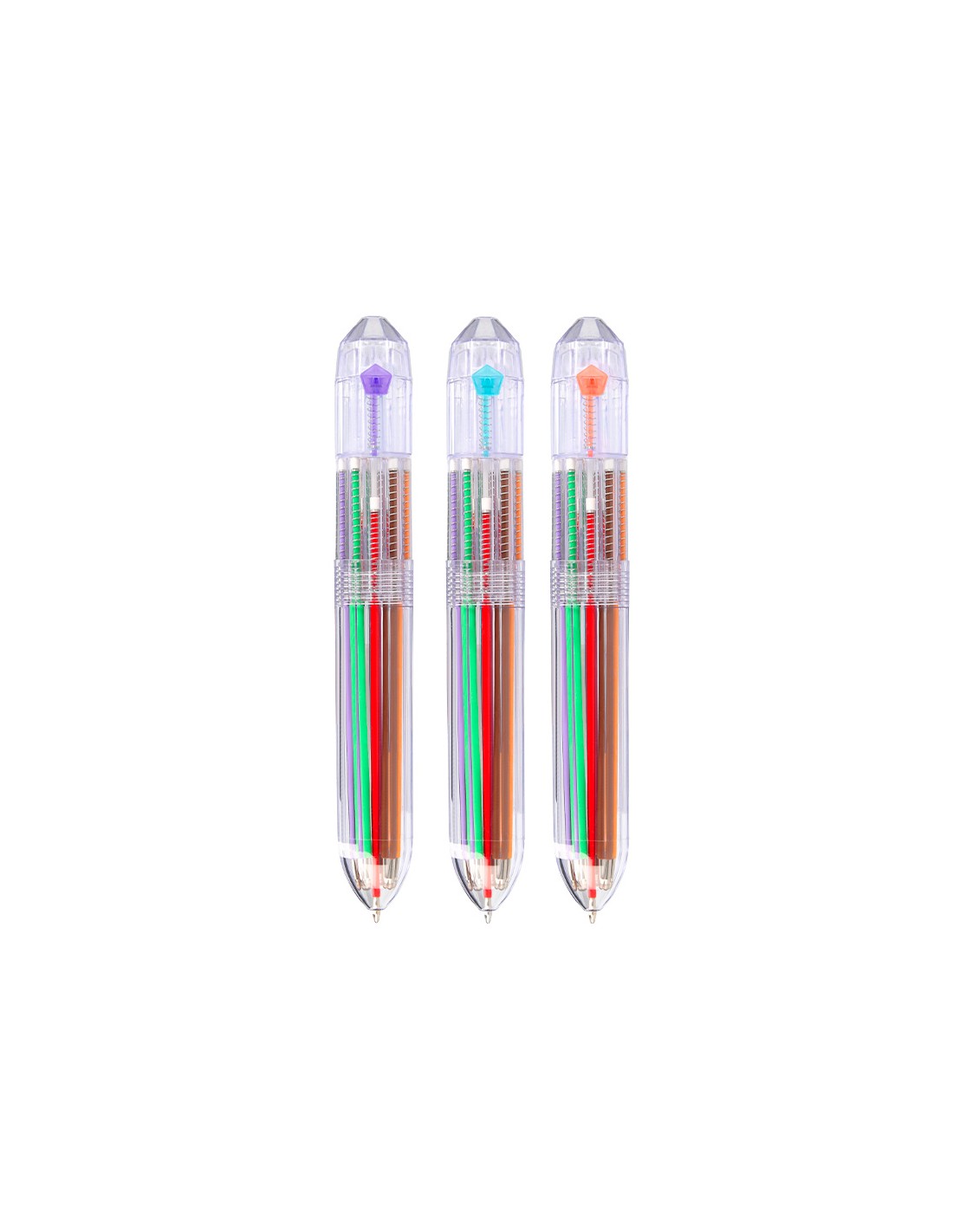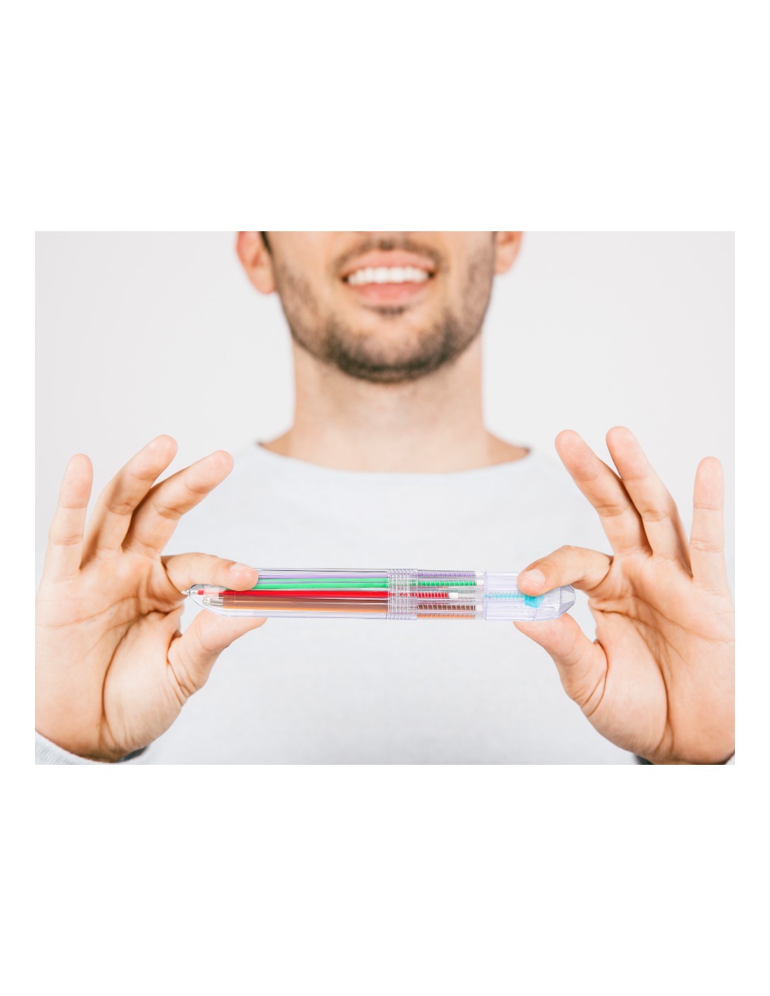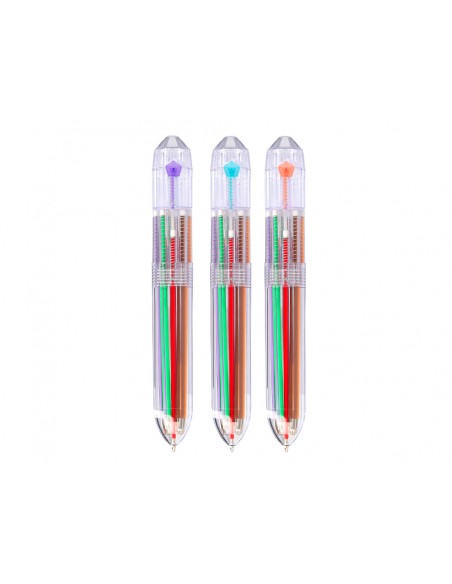 Bolígraf retràctil multifunció amb tinta a base d´oli. Complet sistema 10 en 1: amb 10 colors de tinta (groc, blau, celeste, marró, taronja, negre, vermell, rosa, verd i violeta). Cos de plàstic transparent. Punta de 1mm. Traç del bolígraf de 0,7 mm.