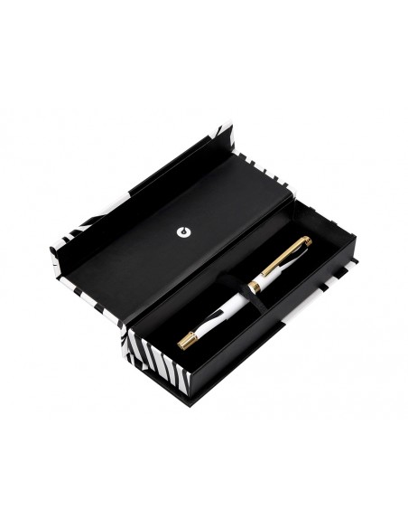 El roller Dualità combina un disseny modern i atrevit, amb un cos en blanc decorat amb traços estil zebra en negre i detalls metàl·lics daurats. Ve presentat a una moderna caixa de tancament magnètic que juga amb la inversió de colors, incorporant una solapa interior en contrast. El disseny en blanc i negre invertits representa el contrast i la dualitat presents a la joventut, capturant la seva energia. La col·lecció es caracteritza pel disseny elegant, contemporani amb un estil únic. Cada detall ha estat curosament elegit per crear un impacte visual fort i cridaner. Tinta color negre. Gruix mida 0,7 mm.