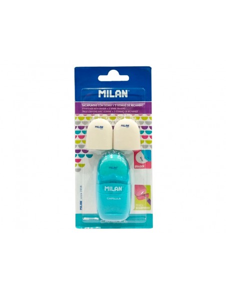 Original maquineta de la marca MILAN CAPSULE, material plàstic amb goma d esborrar inclosa i dos recanvis COMBINACIÓ DE GOMA I MAQUINETES. EL SACAPUNTAS TÉ UNA GANIVETA D ACER Al CARBONI AFILADA I RESISTENT, IDEAL PER A TOT TIPUS DE LLAPIS ARTICLE AMB GANIVETA DE SEGURETAT. AQUEST SISTEMA EVITA QUE ES PUGUI SEPARAR LA FULLA DEL COS DEL MAQUINETES, SENT ÒPTIM PER ÚS ESCOLAR. COLORS ASSORTITS BLAU, LILA, ROSA, VERD