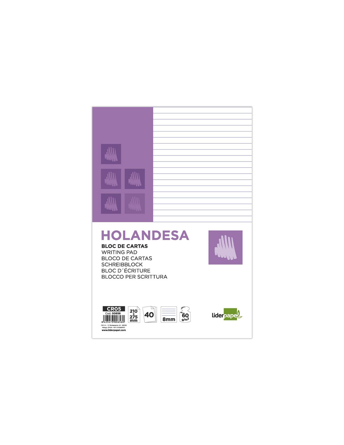 Holandesa. Paper de 60 g/m². Ratllat horitzontal. Encolat. Enllomat. Indicat per escriure cartes. El bloc de 40 fulles.